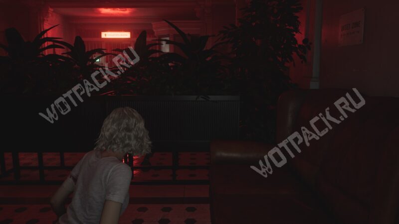 Спуститесь в холл, освещённый красным, и спрячьтесь за длинным кашпо. Дождитесь, когда монстр перестанет преследовать Грейс.