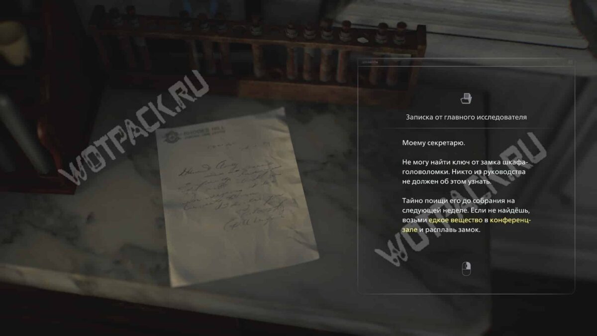 В Resident Evil Requiem при осмотре кабинета главного исследователя можно наткнуться на шкаф-головоломку. Если его открыть, удастся получить второй кварц для двери с выемками, которая находится в основном холле медицинского центра. Следуя подсказке из записки, заберите едкое вещество из конференц-зала, растворите защёлку и введите правильную последовательность символов.