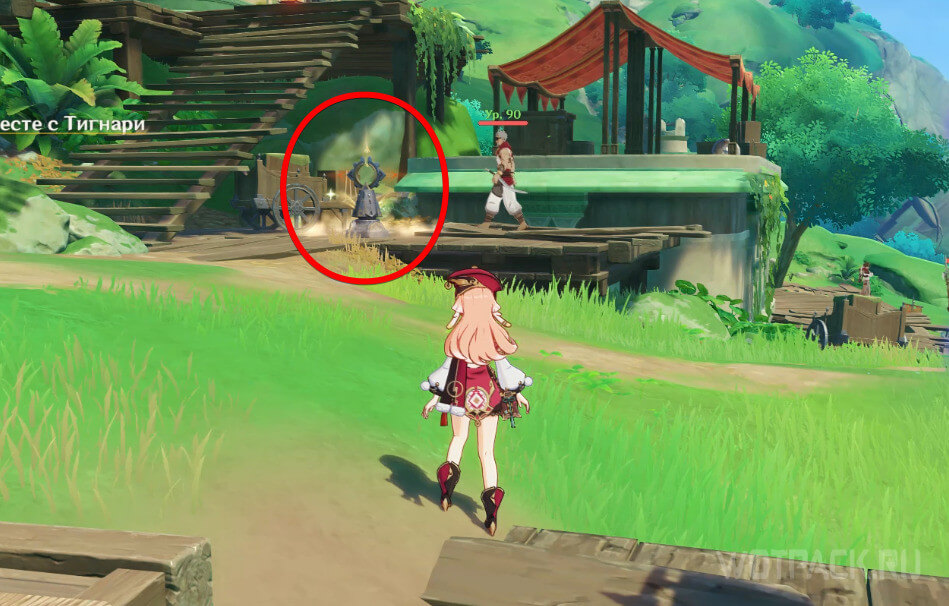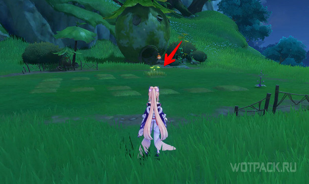 Поднимите Дендро корягу любой Дендро атакой и заберите из-под нее 10000 моры. Хиличурла рядом можно не трогать.
