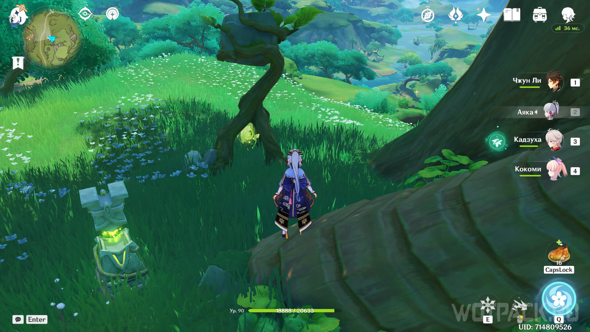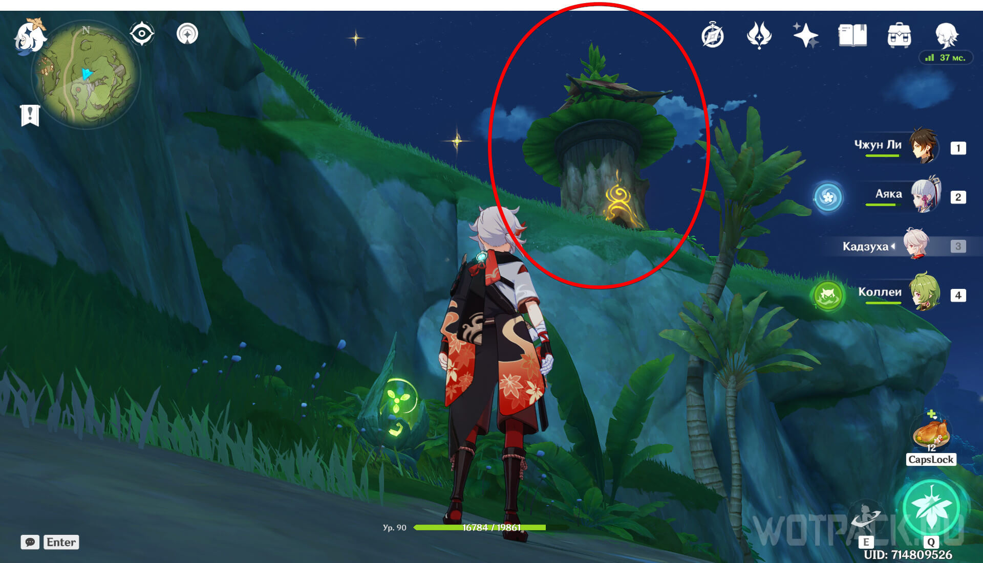 Здесь рядом с загадкой сидит лавачурл, но его можно не трогать. Просто разрушьте Дендро камень, запустив в него Дендрогранум с помощью лучника. Затем подбегите и заберите 10000 моры, на всякий случай используя щит.