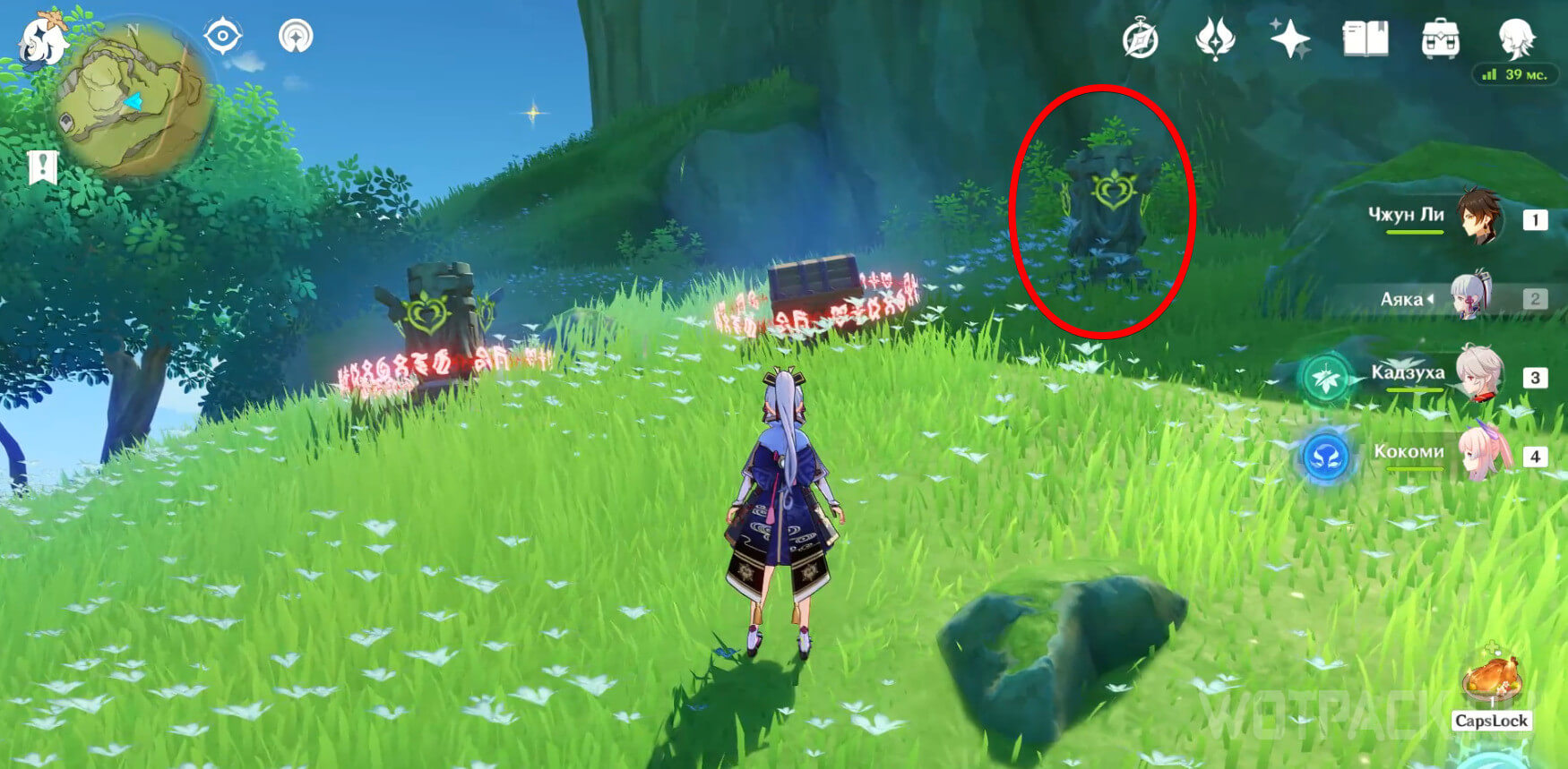 В той же пещере есть загадка с рунами на земле и тремя Дендро корягами вокруг них. Чтобы получить награду, нужно зажечь весь рисунок. Для этого, с помощью навыков Дендро персонажей или Дедрогранумов, поднимите все камни. Тогда руны загорятся и появится обычный сундук.