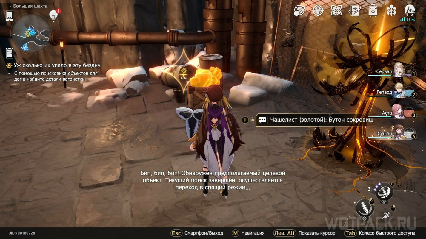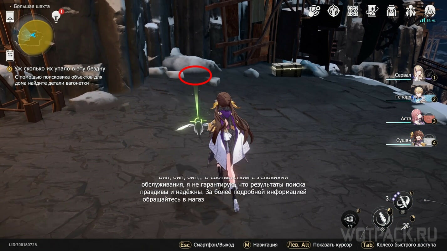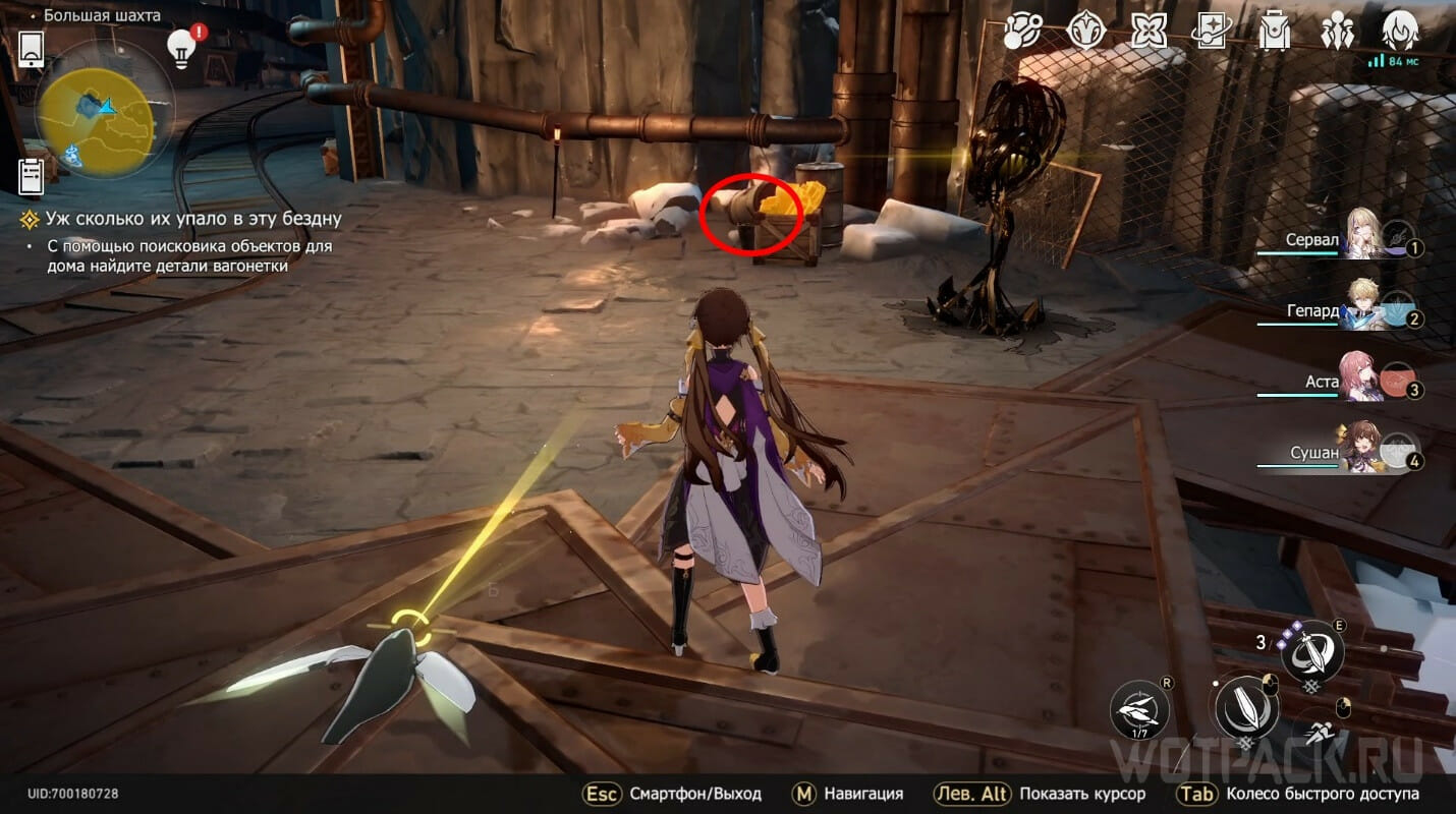 Следующая деталь расположена чуть дальше. Можете сразу подняться наверх к золотому Чашелисту, разместив индикатор в этой зоне. Световая линия укажет на бочки и ящики с рудой. Взаимодействуйте с объектом, чтобы подобрать Колесную пару вагонетки.