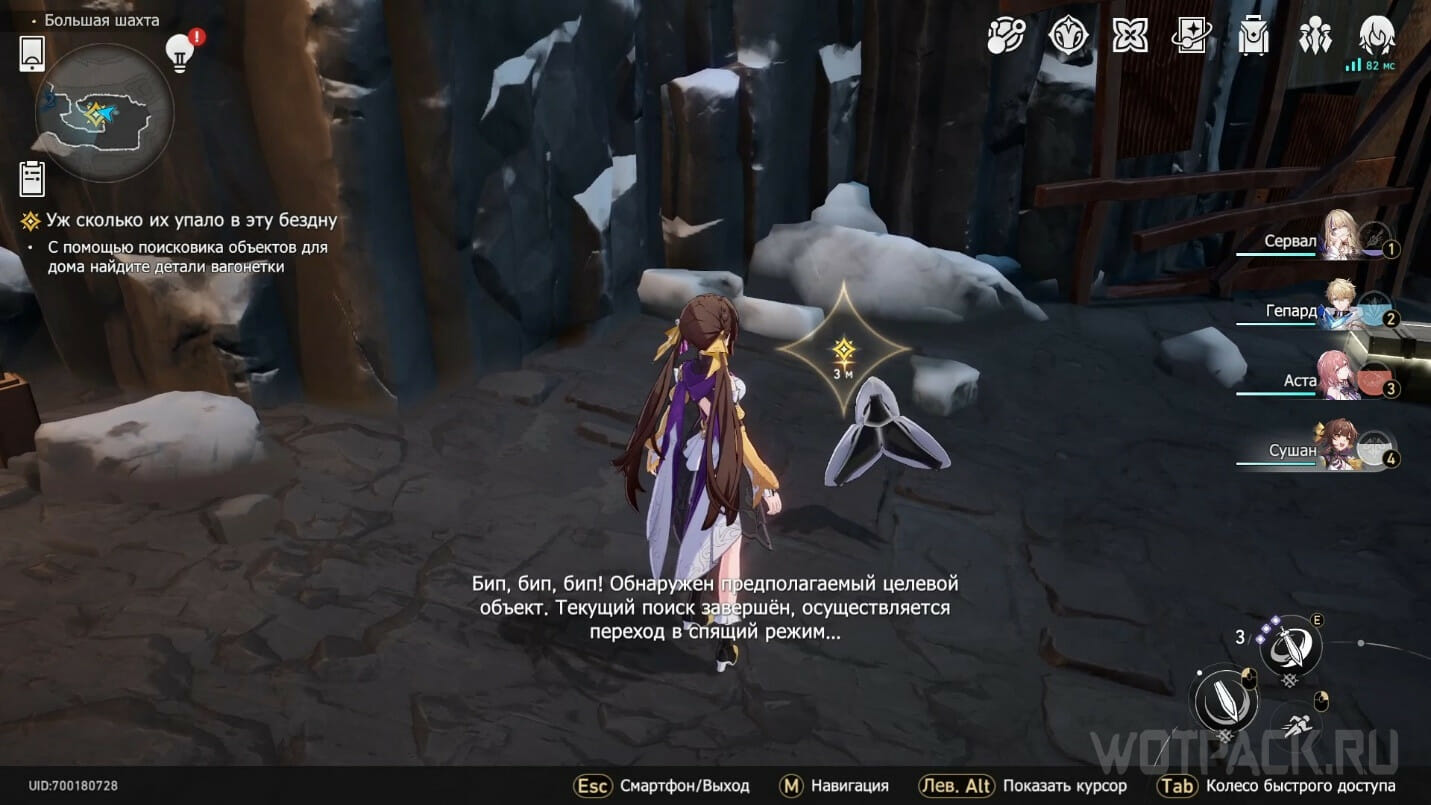 С испытанием поиска можно впервые столкнуться в процессе сюжетного задания «Уж сколько их упало в эту бездну». Для того чтобы починить вагонетку, необходимо найти детали поблизости, в чем может помочь робот по имени Находюша.