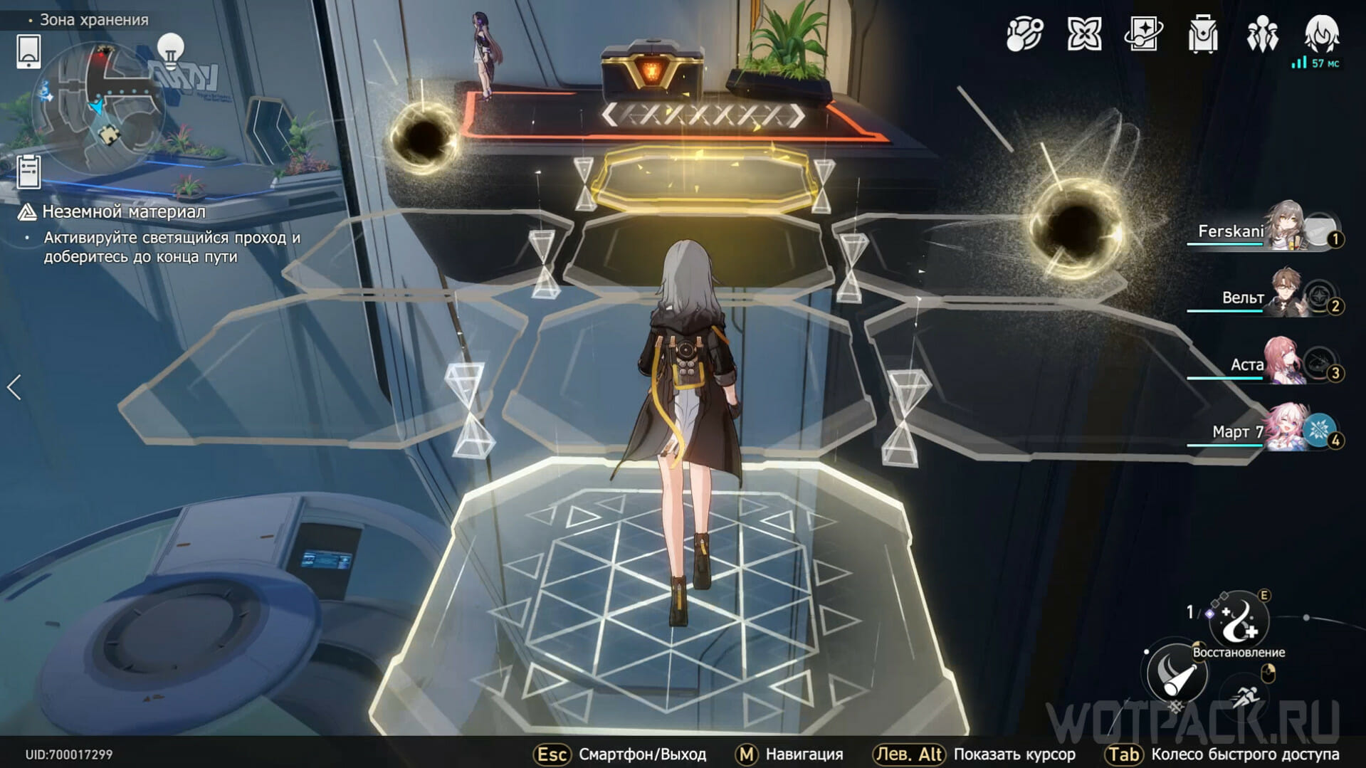Нажмите «Осмотреть», заняв положение на плите Неземного материала. Пройдите два шага влево, один вперед и с помощью подобия черной дыры телепортируйтесь ко второй. От нее следуйте зигзагом к последнему светящемуся блоку. С прохождением головоломки появится путь к ценному сундуку.