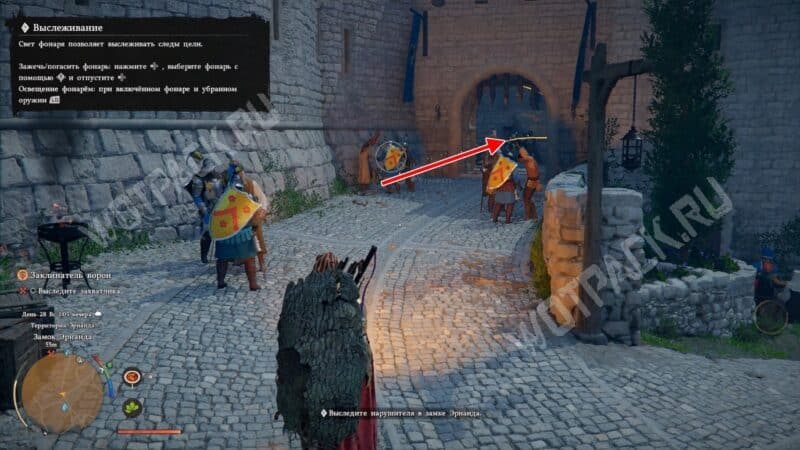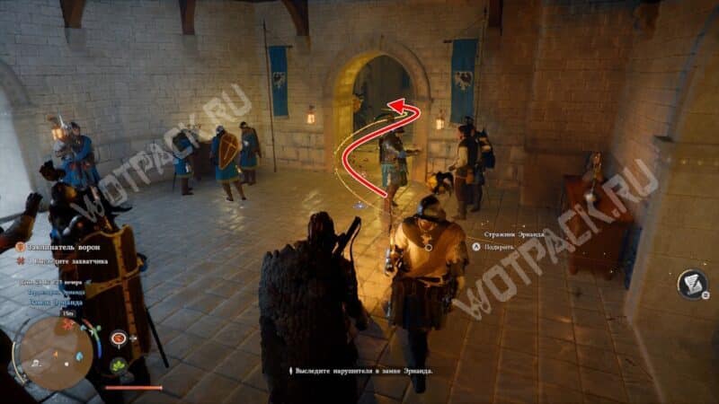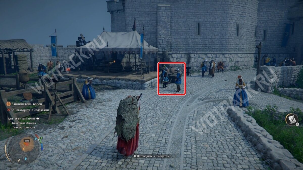 После разговора с ведьмой мудрости переместитесь в столицу. Войдя во двор замка, поговорите с солдатами, которые явно чем-то встревожены. Из диалога узнаете, что нарушители прошли мимо стражи во внутреннюю часть крепости и внезапно пропали. Повсюду разбросаны вороньи перья, которые помогут отыскать путь.