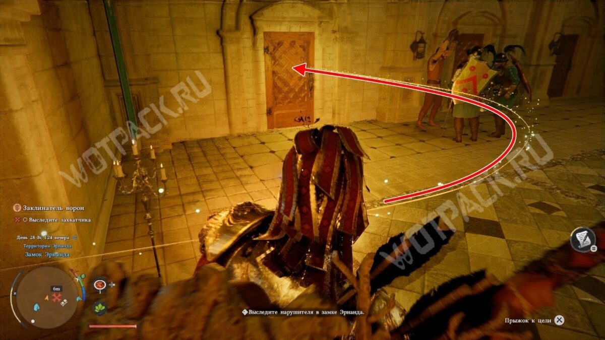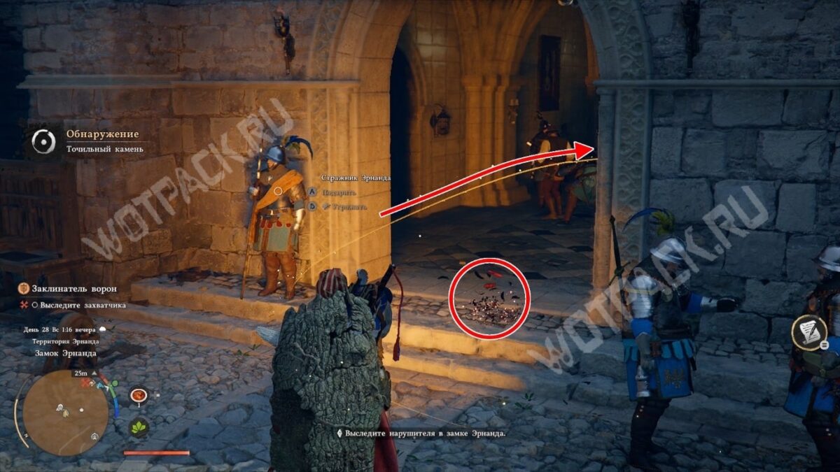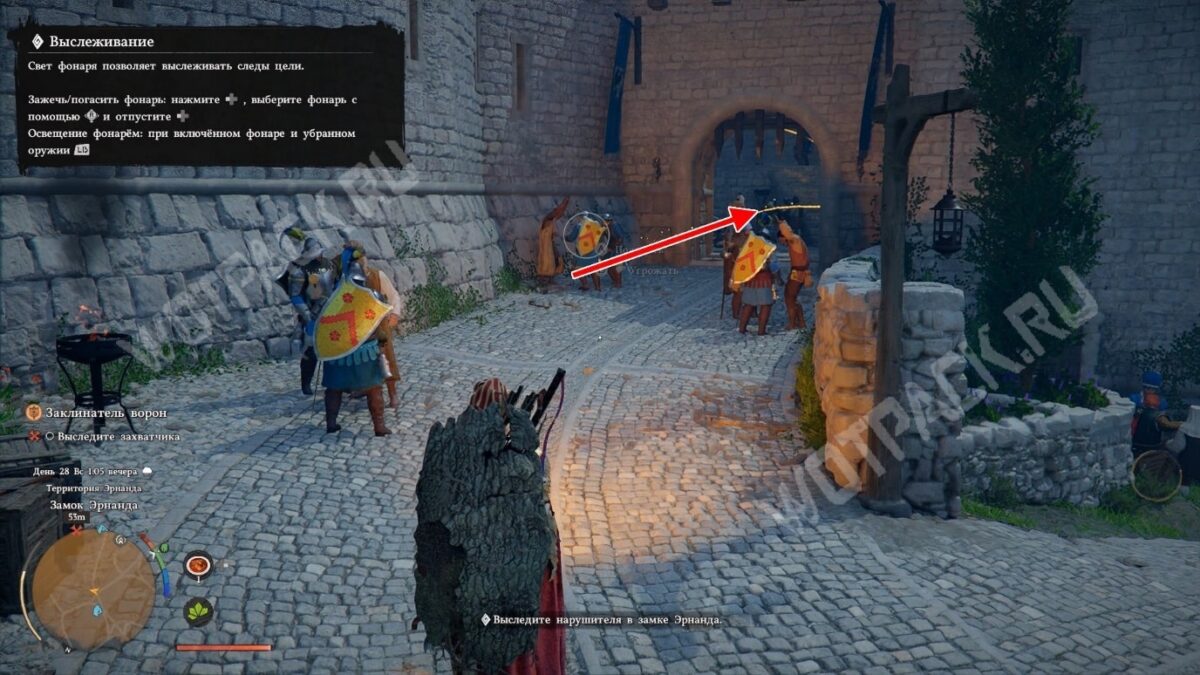 Под действием направленного света проявится магическая линия — двигайтесь за ней и выследите нарушителя в замке Эрнанда. Внутри крепости будут дополнительные подсказки в виде витающих над полом вороньих перьев.