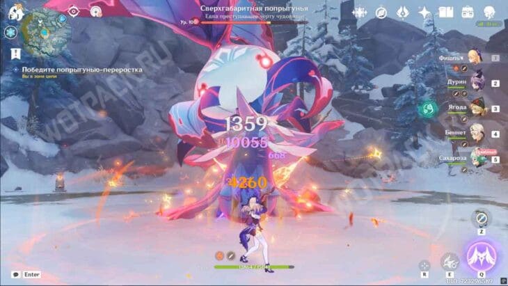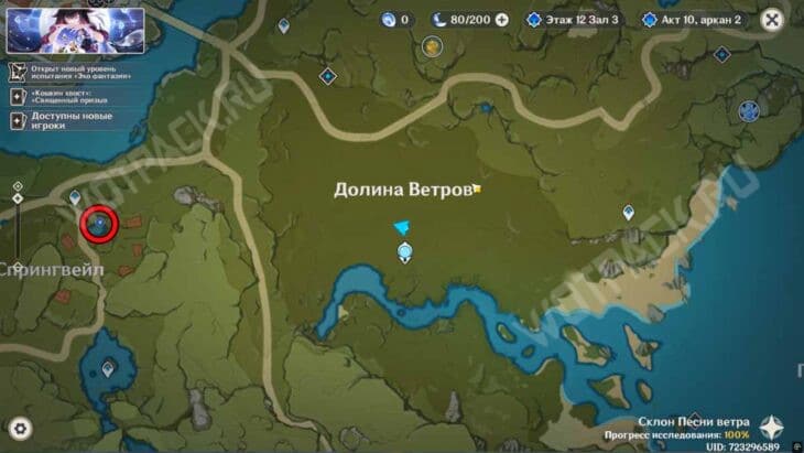 Отправляйтесь в долину Ветров, используя статую Архонтов для быстрого перемещения. Как только войдете в зону, начнется бой с летающим противником, имеющим иммунитет к Анемо атакам. При этом в отряд добавится пробная Сахароза, как раз владеющая этим элементом.