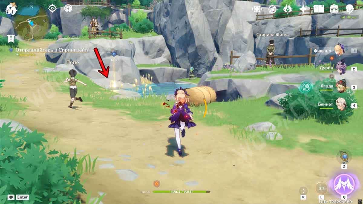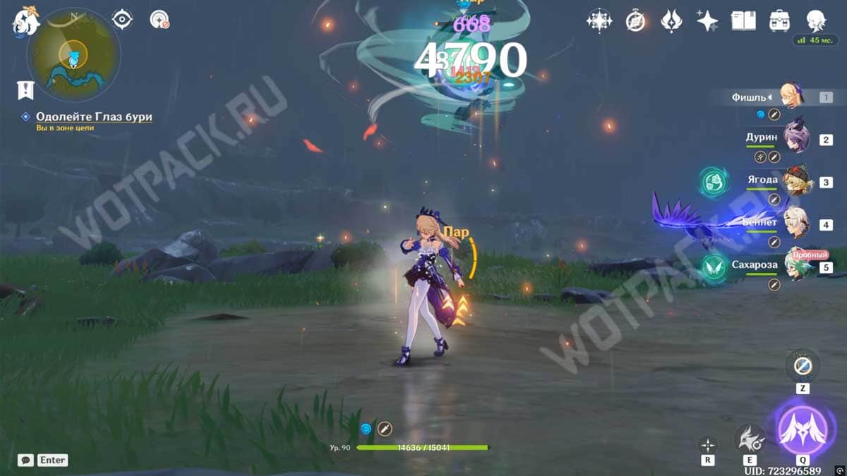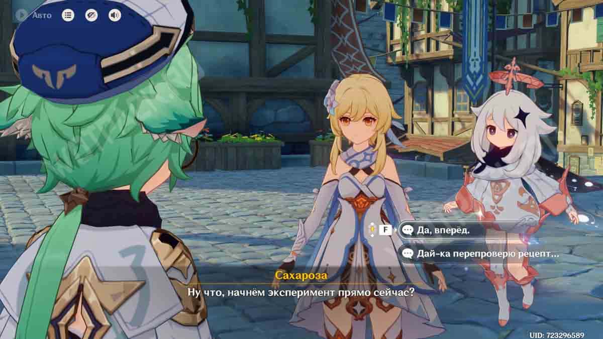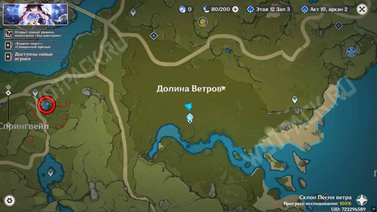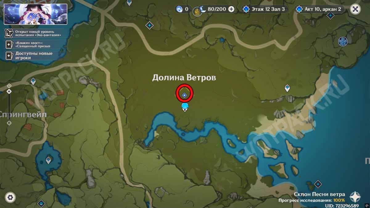 Отправляйтесь в долину Ветров, используя статую Архонтов для быстрого перемещения. Как только войдете в зону, начнется бой с летающим противником, имеющим иммунитет к Анемо атакам. При этом в отряд добавится пробная Сахароза, как раз владеющая этим элементом.