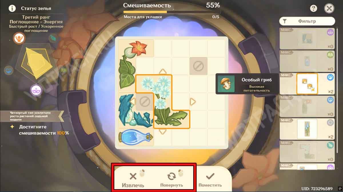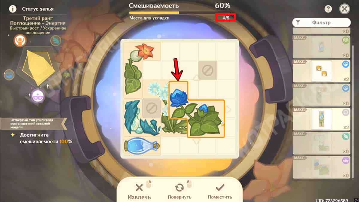 Процесс приготовления эликсира напоминает ивент «Чудесные зелья». Чтобы создать четвёртый тип усилителя роста растений седьмой модели, берите материалы и перетаскивайте их на белое поле, стараясь уместить как можно больше цветков. Достигните смешиваемости 100%, не обращая внимание на получаемый статус.