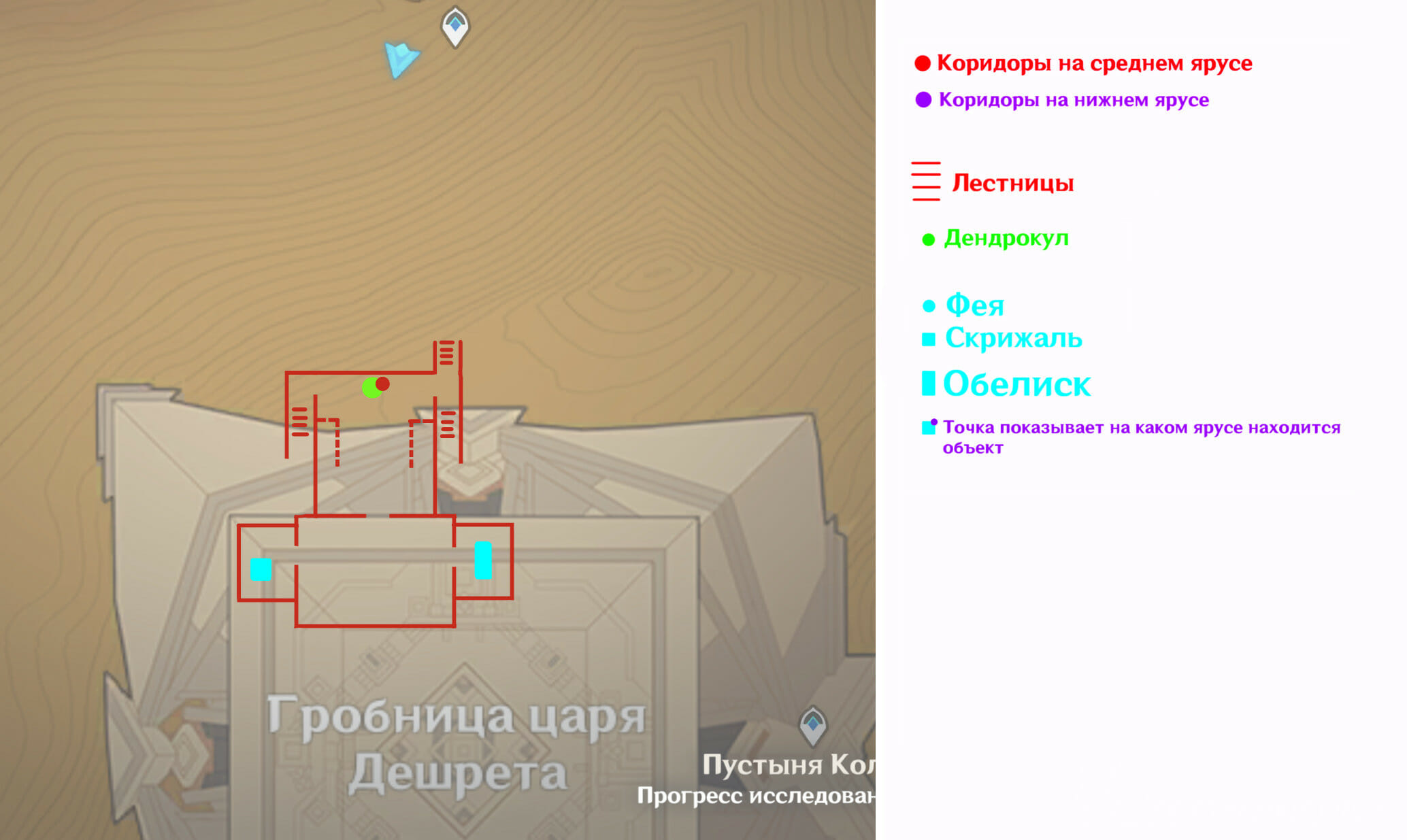 От домика феи проследуйте на север, в сторону лагеря Фатуи. Внутри ближайшей ко входу в Зал палатке лежит Скрижаль: Восход. На заваленной колонне, расположенной у лестницы, сможете забрать Дендрокул: он находится на самой верхушке конструкции.