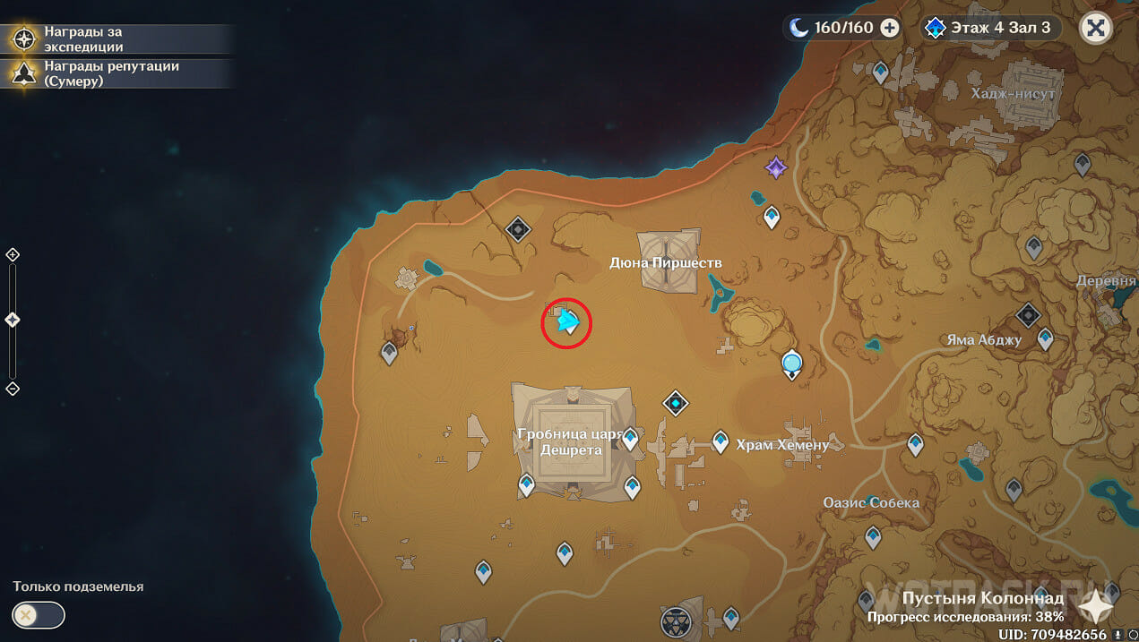 Если по мере выполнения задания не удалось активировать скрытую путевую точку, то воспользуйтесь Плитой красных песков и загляните в раздел «Спуск в глубины»: почти у самого верха списка найдете нужную локацию. Нажмите кнопку «Перейти», чтобы на карте появился маркер.