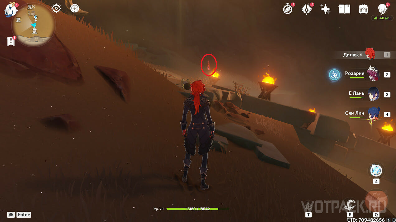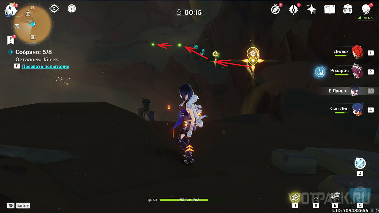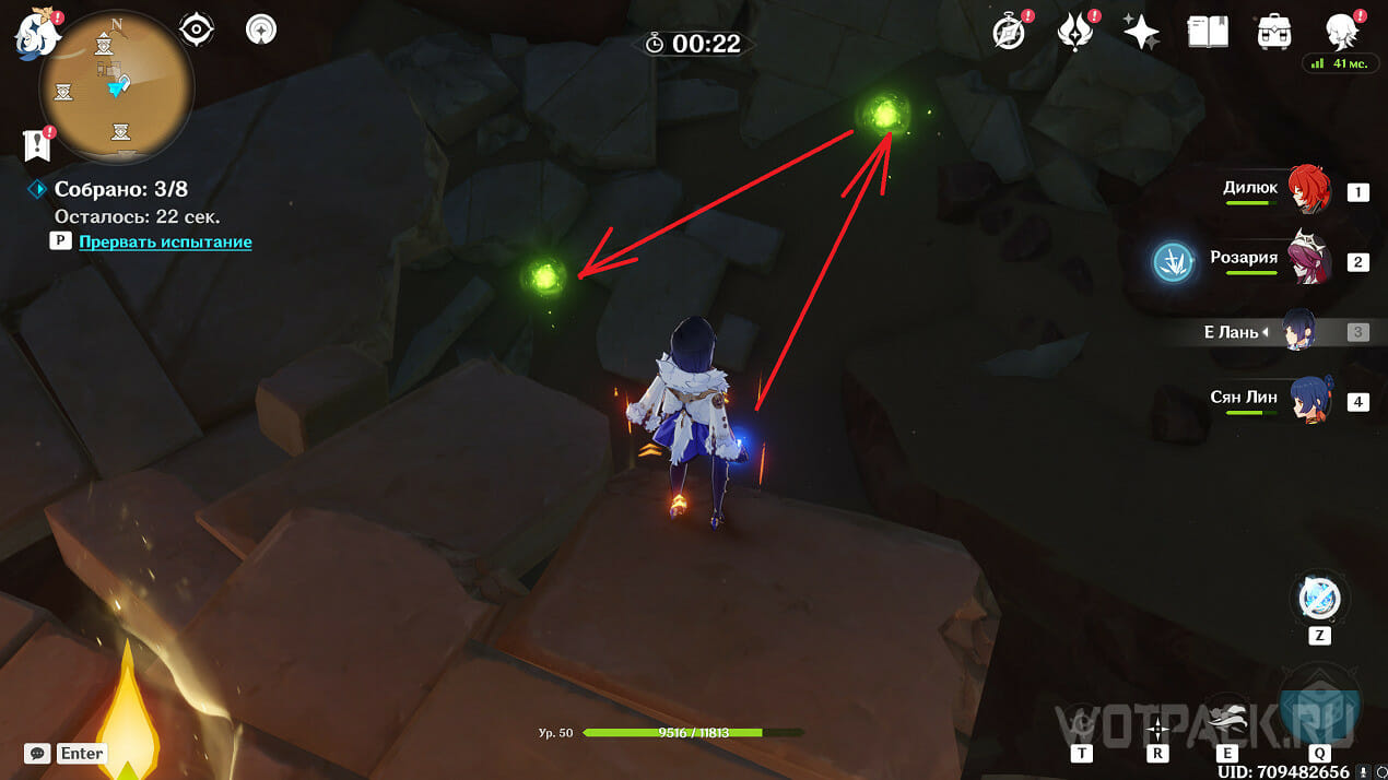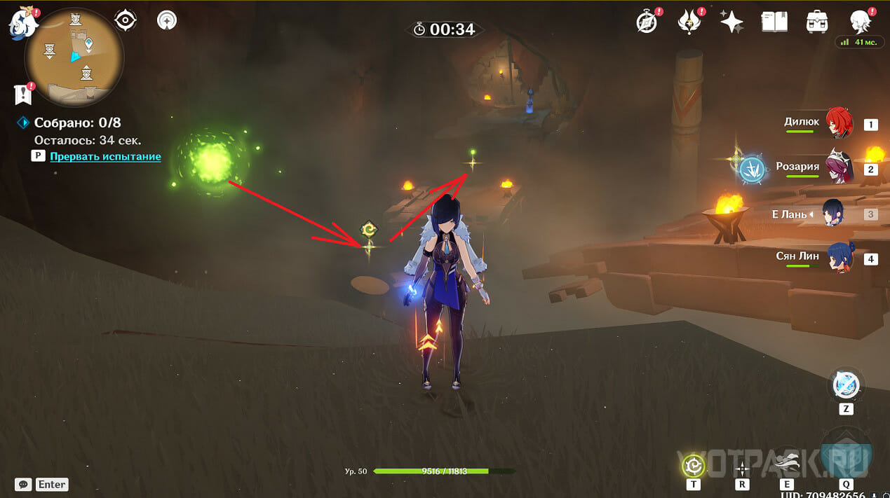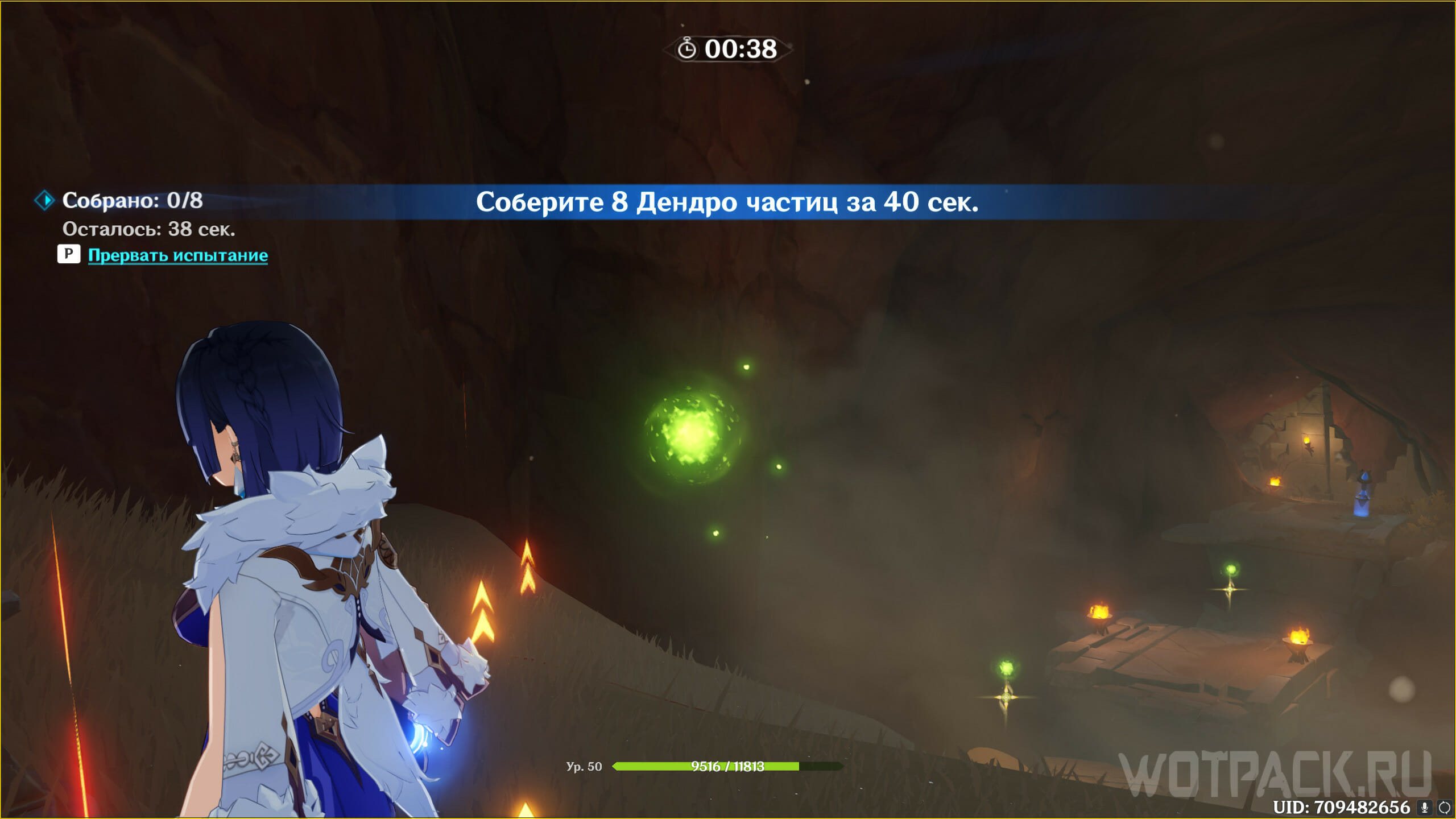 Вернитесь к тропе, ведущей к верхней части зала. Справа от дороги (напротив, если идти от палатки) расположено испытание на время. Необходимо собрать 8 Дендро частиц за 40 секунд.