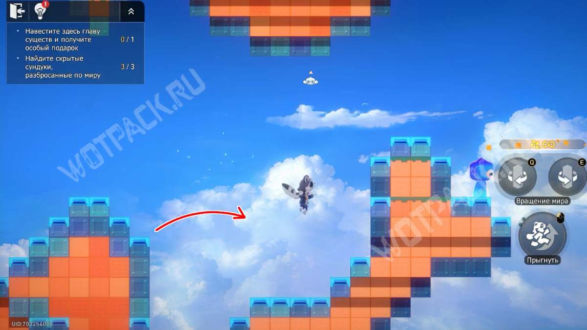 Не используя вращение, пройдите вперед и заберите сокровище в «ямке» на нижних платформах.