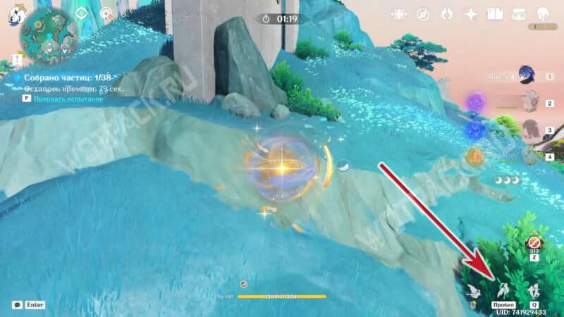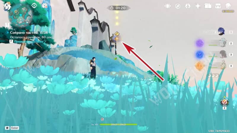 Первым испытанием станут прыжки по колоннам. За 85 секунд соберите с них 7 частиц Гео, забравшись на столбы в указанном порядке. После забега рядом с Чжансунем появится награда в виде обычного сундука.