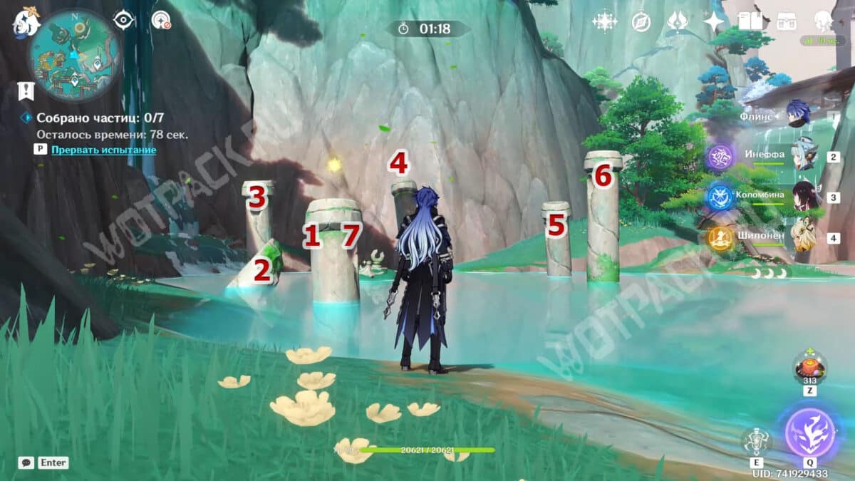 Первым испытанием станут прыжки по колоннам. За 85 секунд соберите с них 7 частиц Гео, забравшись на столбы в указанном порядке. После забега рядом с Чжансунем появится награда в виде обычного сундука.