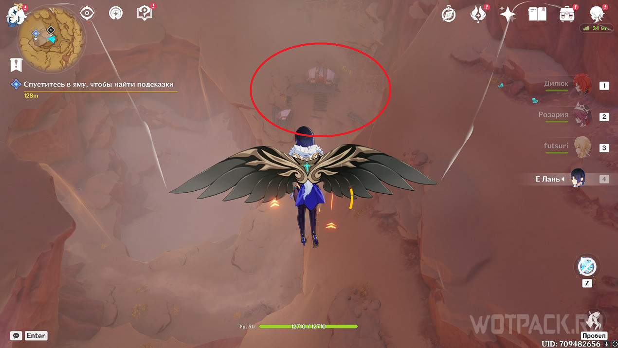 У западной части ямы удастся обнаружить небольшой лагерь, в который Путешественнику необходимо отправиться. Когда приблизитесь к нужному месту, Паймон заметит, что там кто-то есть.