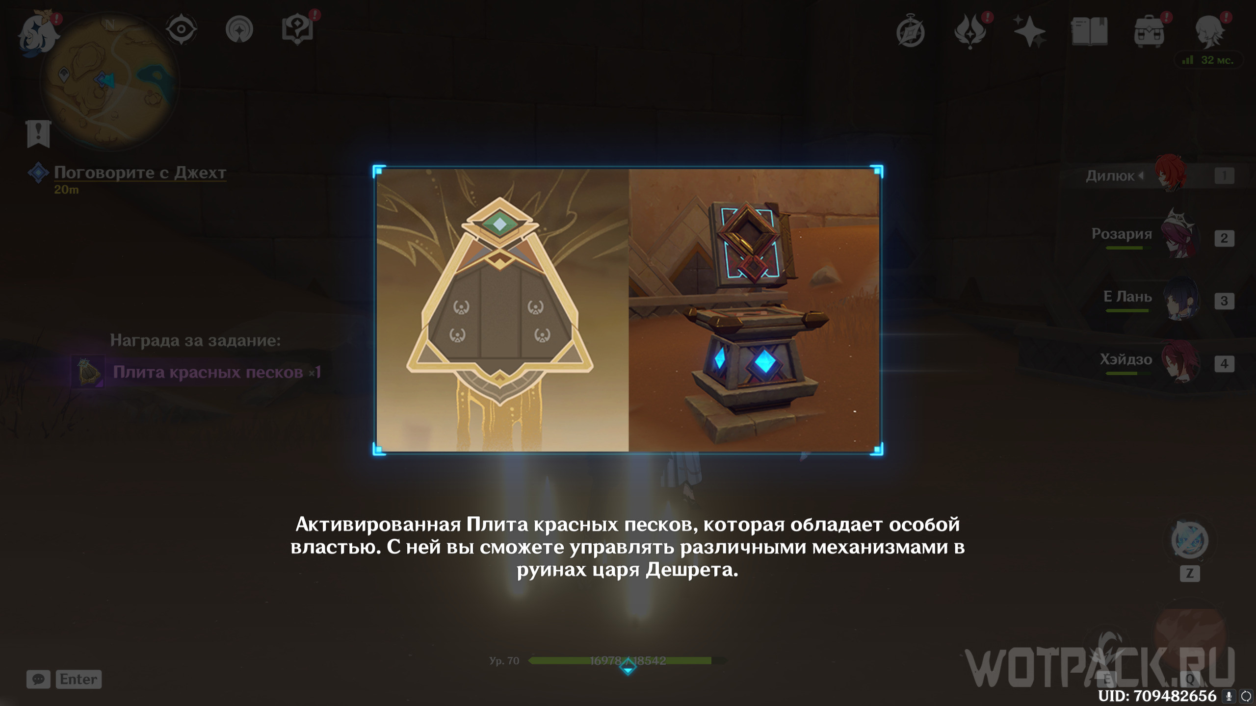 Мужчина передаст Путешественнику Плиту красных песков. Активированный инструмент обладает особой властью, с которой получится управлять различными механизмами в руинах царя Дешрета, чтобы исследовать их еще глубже. По мере продвижения Плита красных песков будет постепенно открывать расположение важных мест в руинах. Следуйте указаниям и особенной властью запускайте механизмы, чтобы попасть в неизведанные части строения.