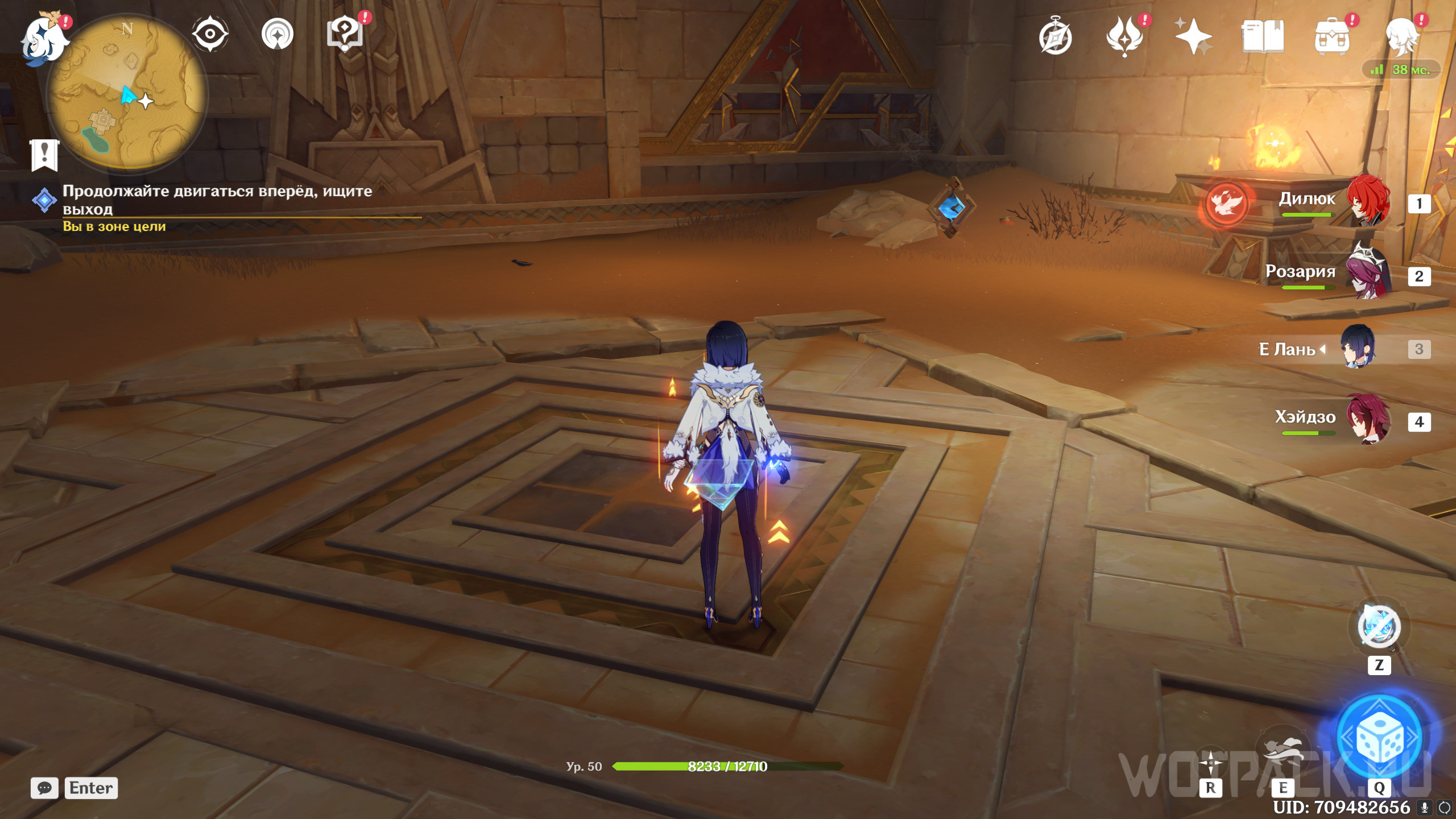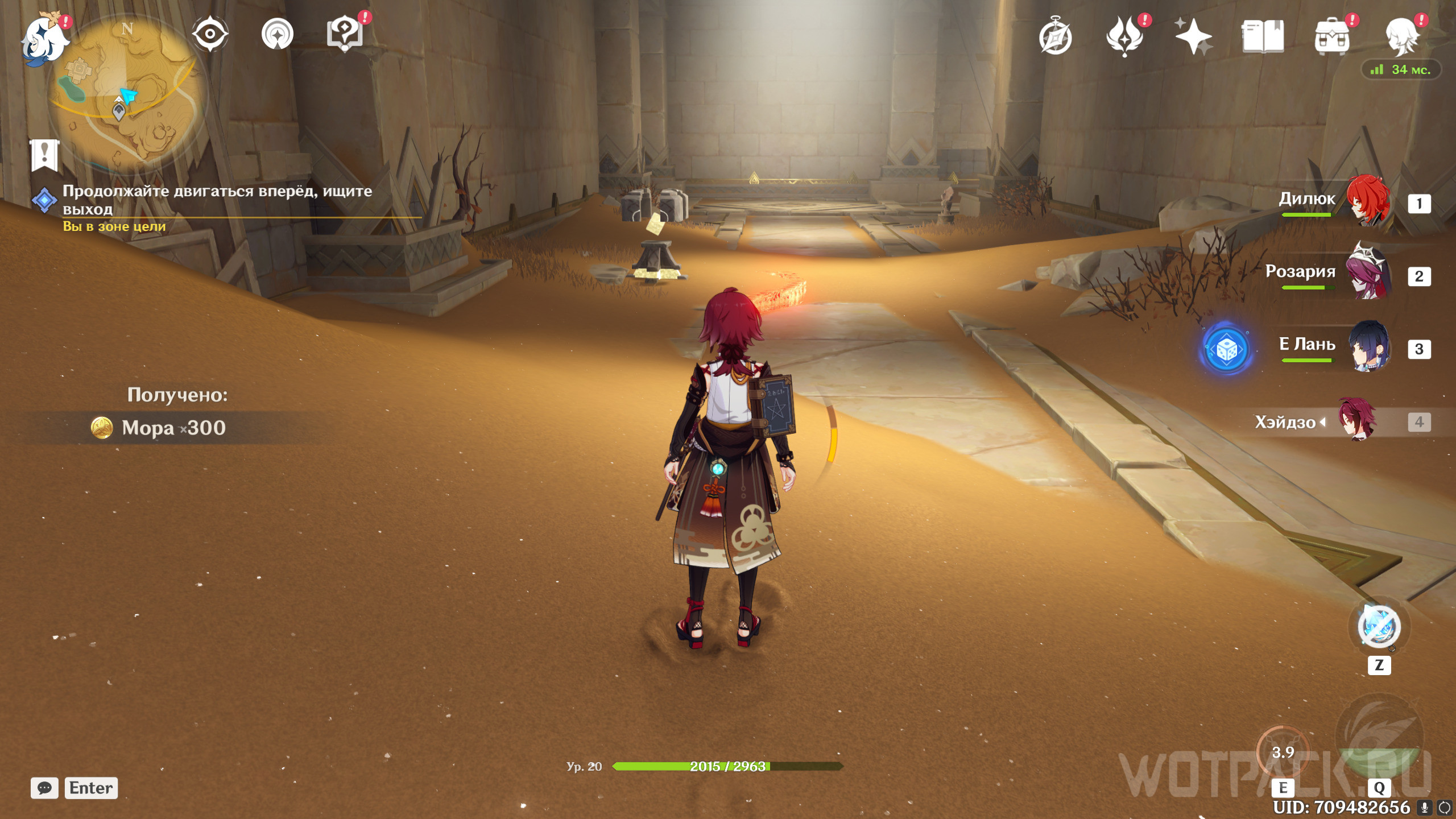 Ищите выход, следуя за направлением ветра. На развилке необходимо повернуть направо. Если пойти налево, то выйдете к еще одним руинам. Идя по правильному пути, войдите в первую арку и увидите долгожданное небо, сигнализирующее о выходе на свободу. Пробегите мимо хиличурлов и, когда окажетесь на улице, задание завершится. Кроме того, заработаете достижение Экспедиция в пустыню.