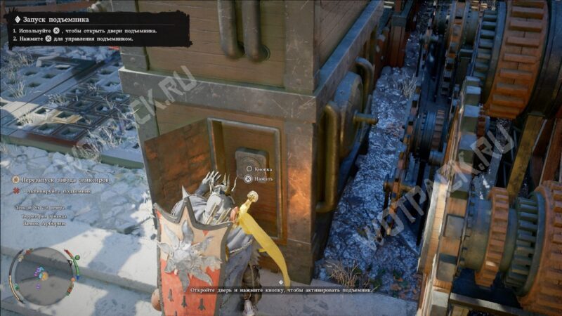 Поднимитесь обратно к конвейеру. Справа от спуска в цех культивации находится вентиль — возьмитесь за него и поворачивайте влево, пока не откроется люк с рычагом. Заберитесь на агрегат и потяните за рукоять.