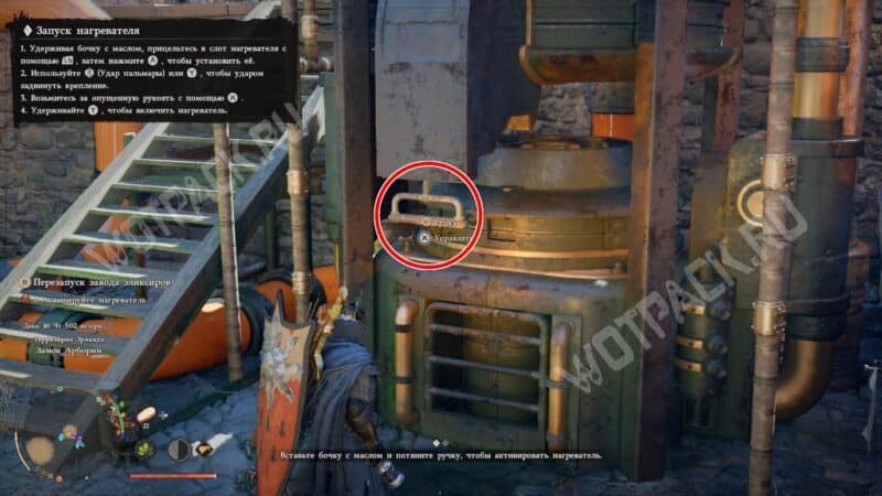 Зайдите за ёмкость с оранжевой жидкостью справа от нагревателя и найдите там рычаг. Потяните за него, чтобы линия розлива запустилась.