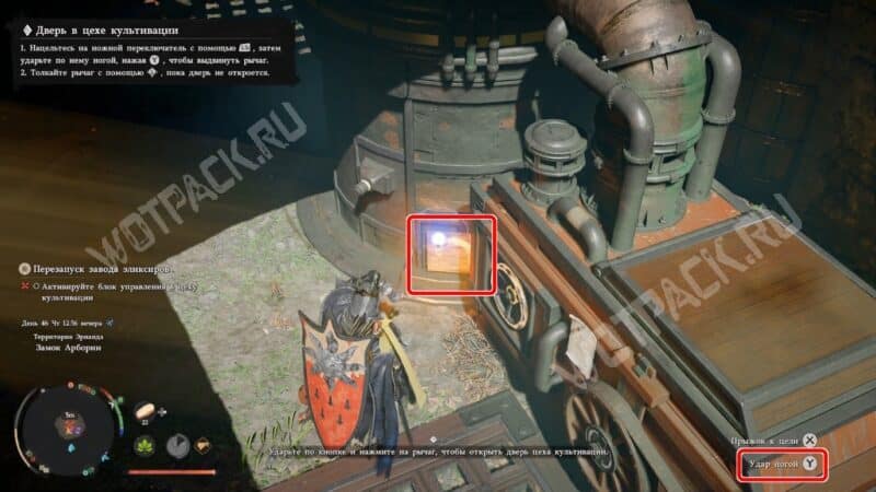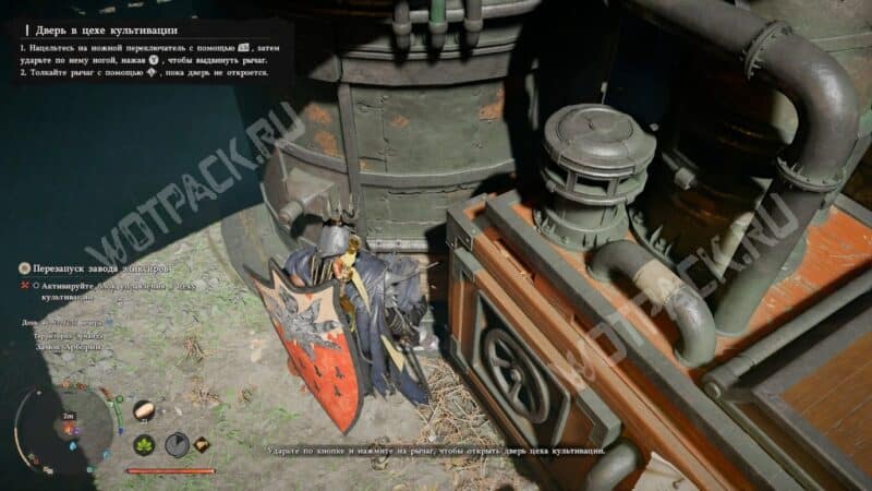 Переключатель для открытия двери — это нажимная панель у основания агрегата. Прицельтесь на «Ctrl» или «LB», наведите указатель на плиту, а затем пните её клавишей «F» или «Y», если играете с геймпада.