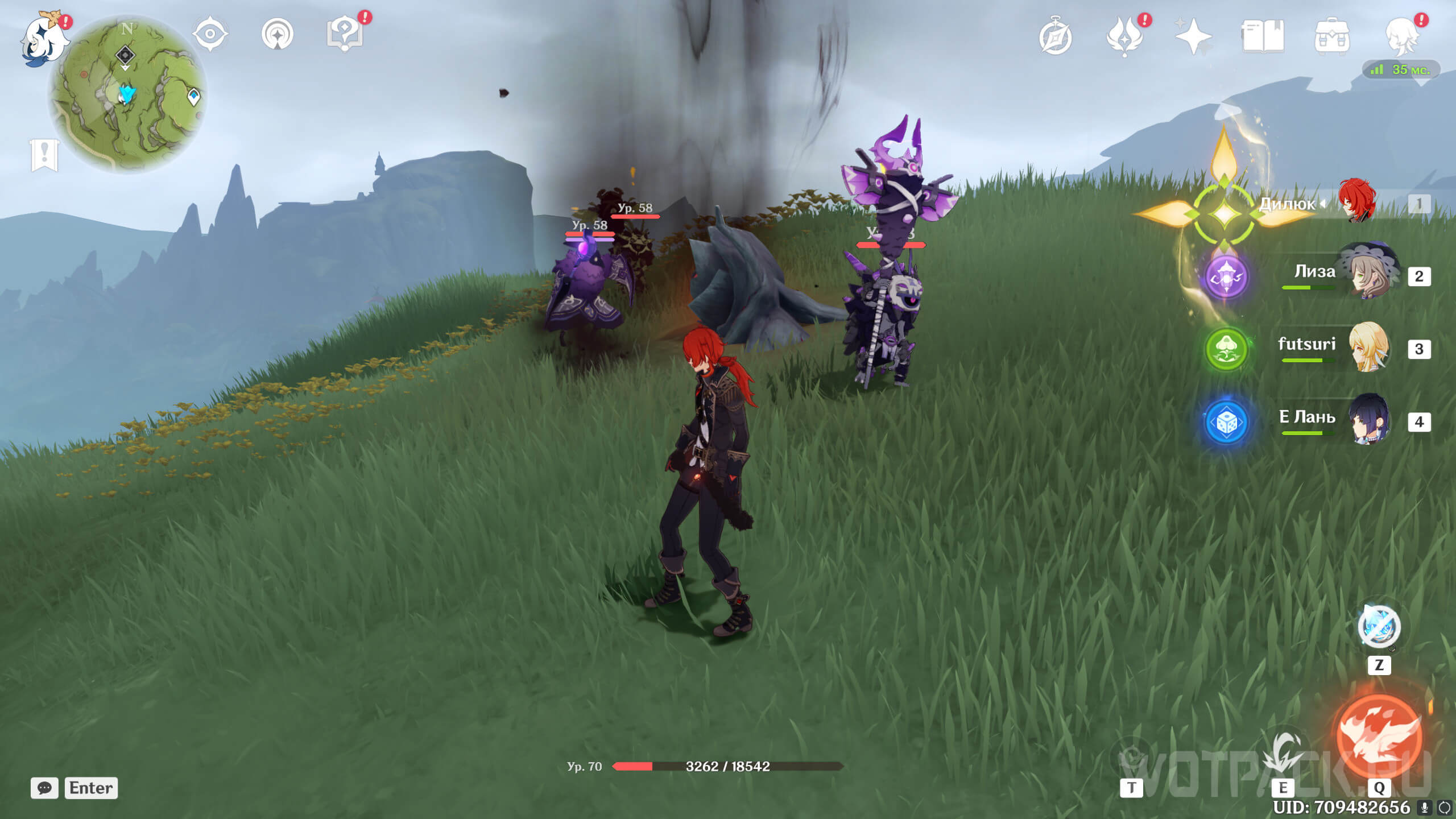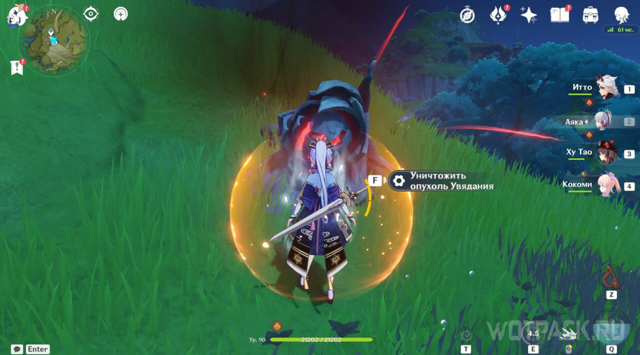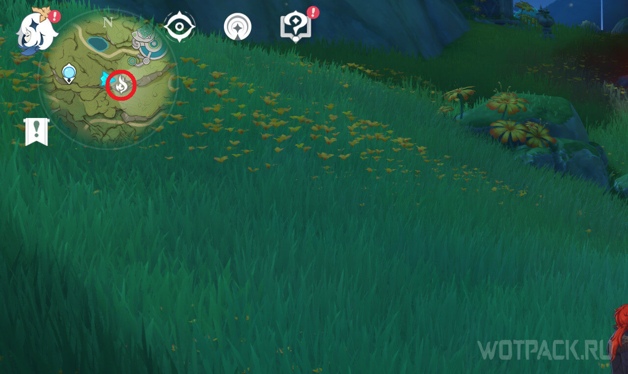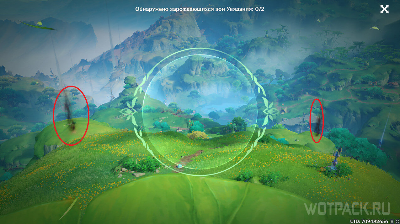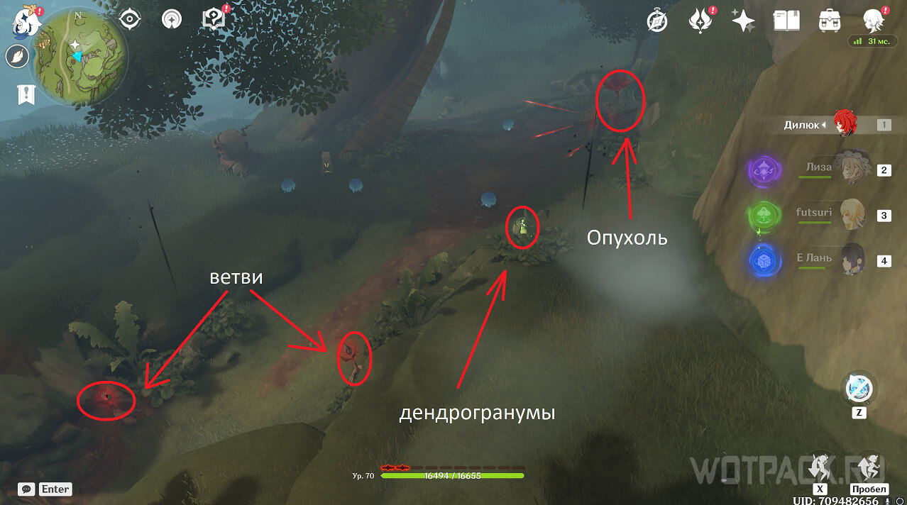 Вторая точка расположена рядом с телепортом, на северо-востоке от Монумента ясны, на возвышении. Ее охраняет несколько хиличурлов. Победите врагов и уничтожьте опухоль.
