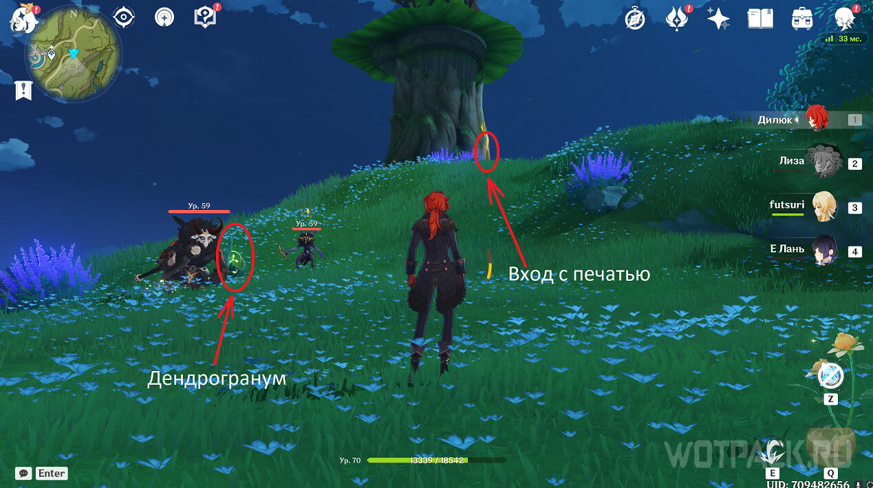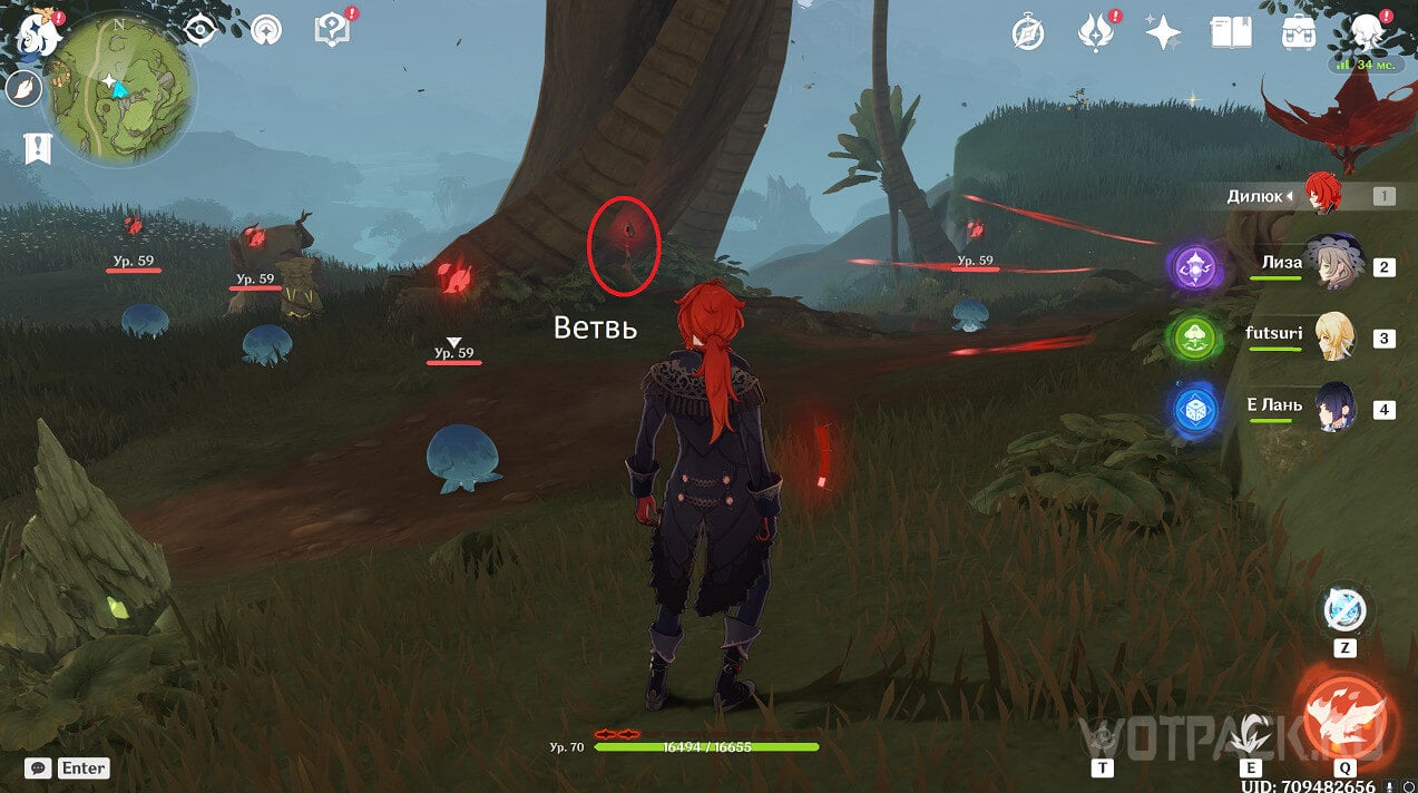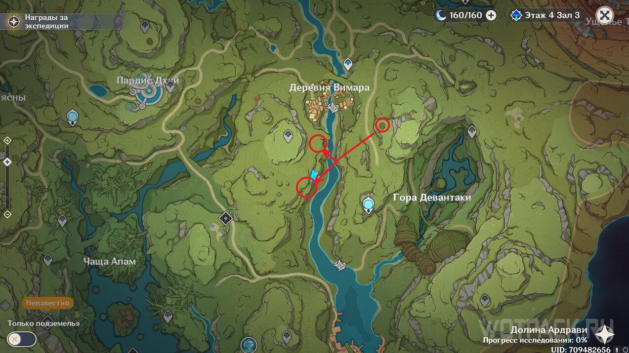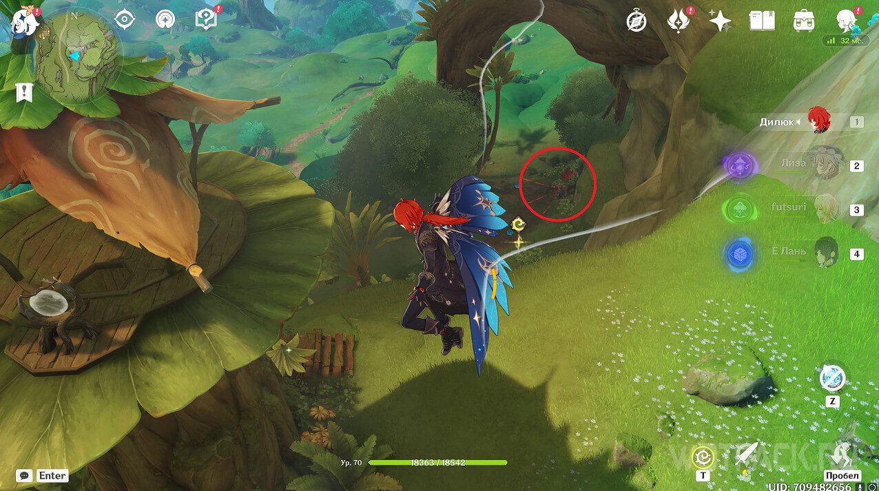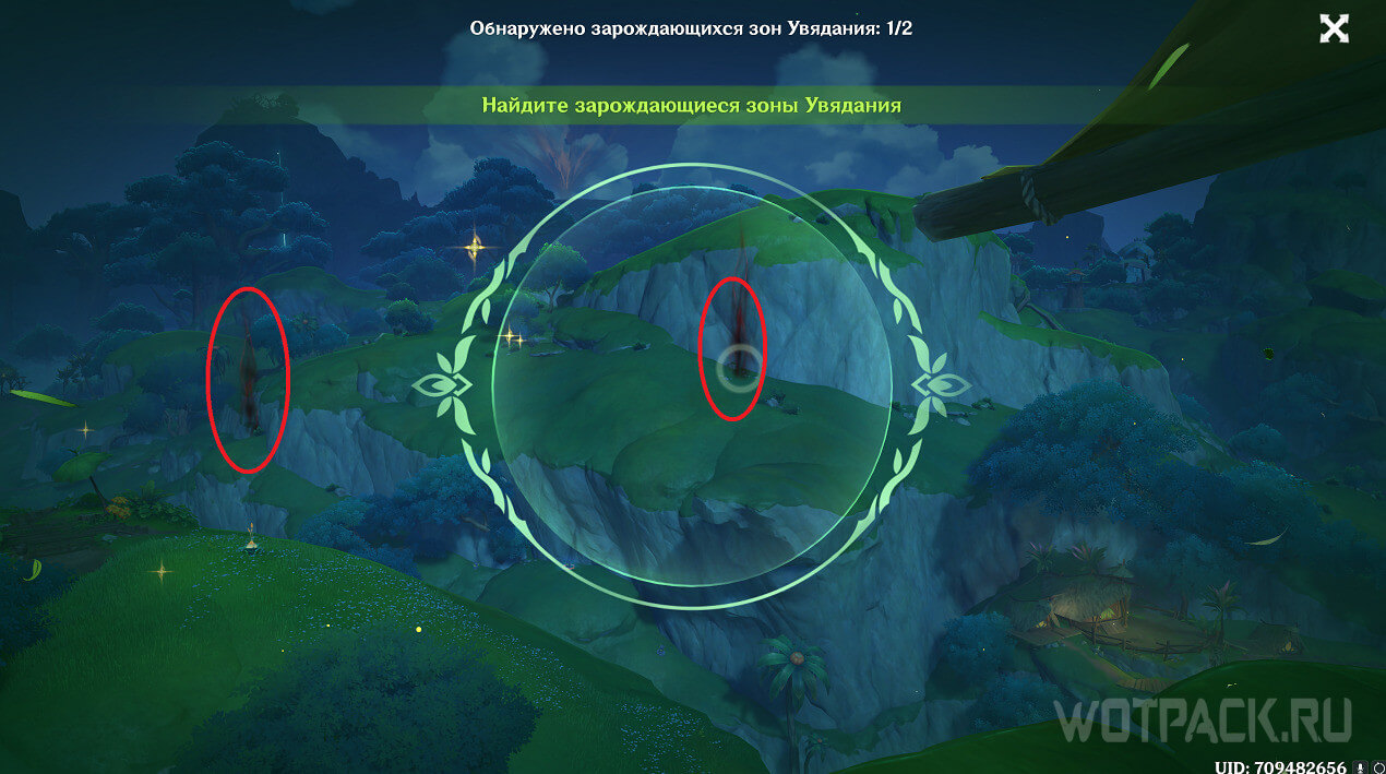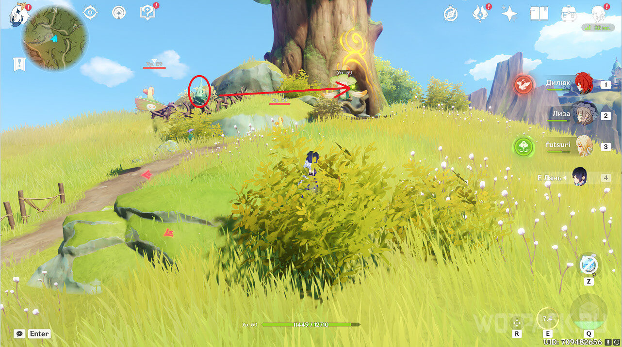 Сначала стоит посетить ту, что ближе. Она расположена на восточном берегу реки, текущей от Деревни Вимара. Перелетите на другую сторону, разберитесь с несколькими хиличурлами (2 обычных и 1 маг бездны) и уничтожьте опухоль Увядания.