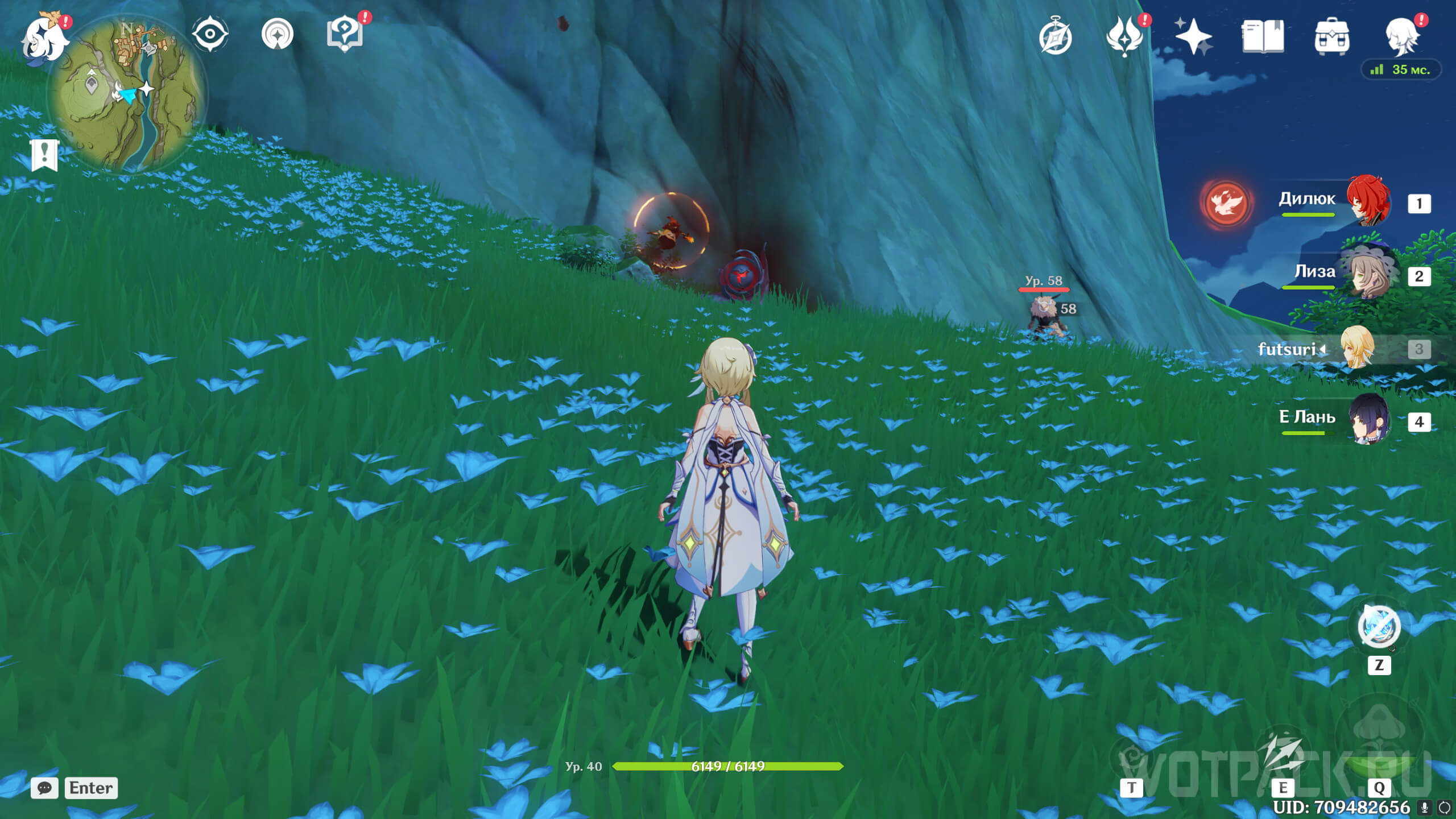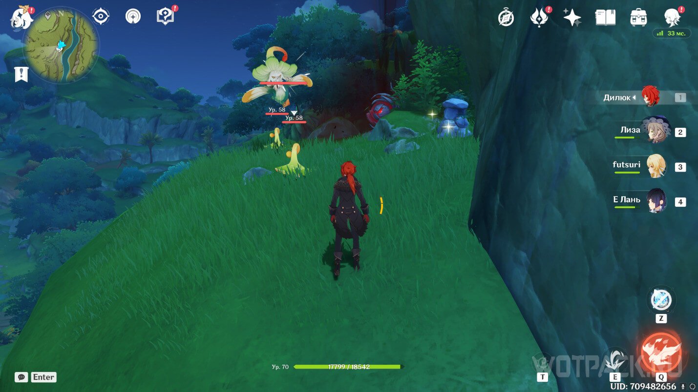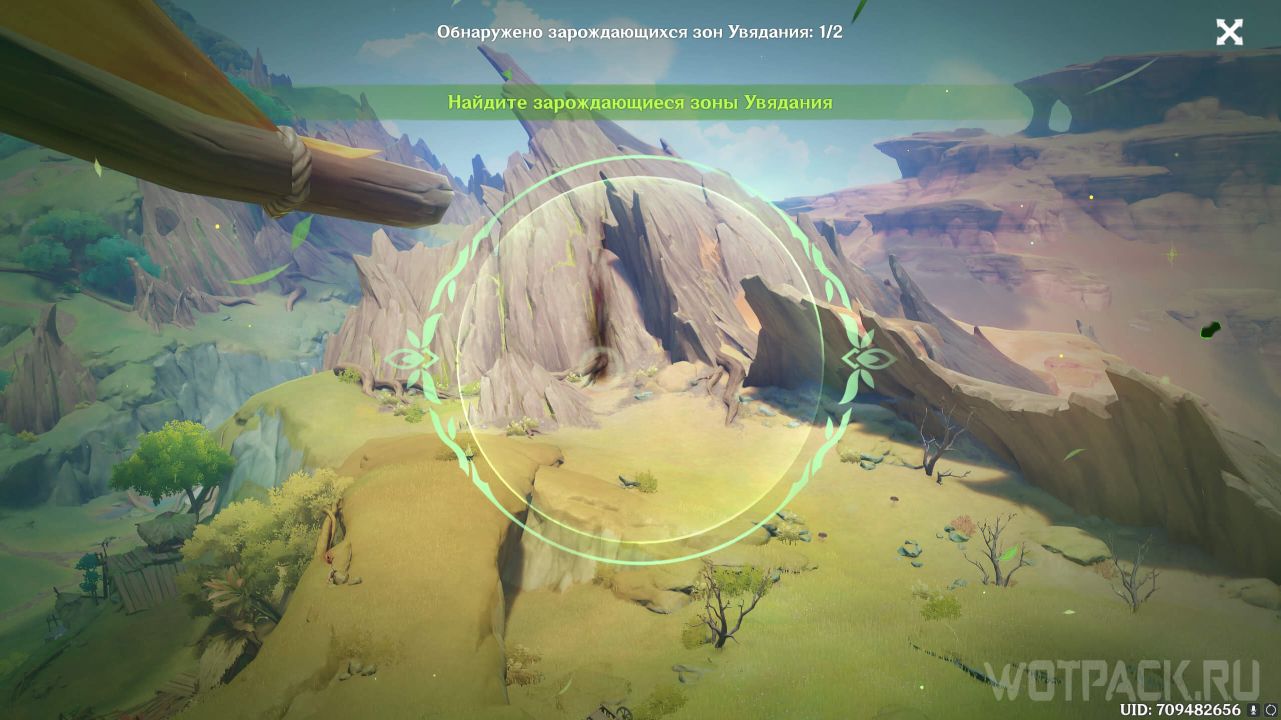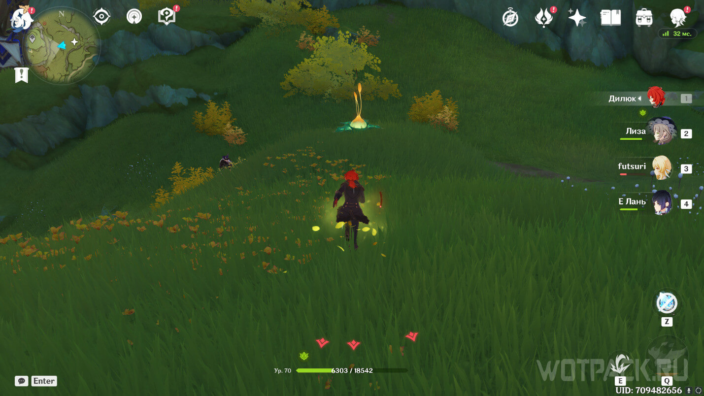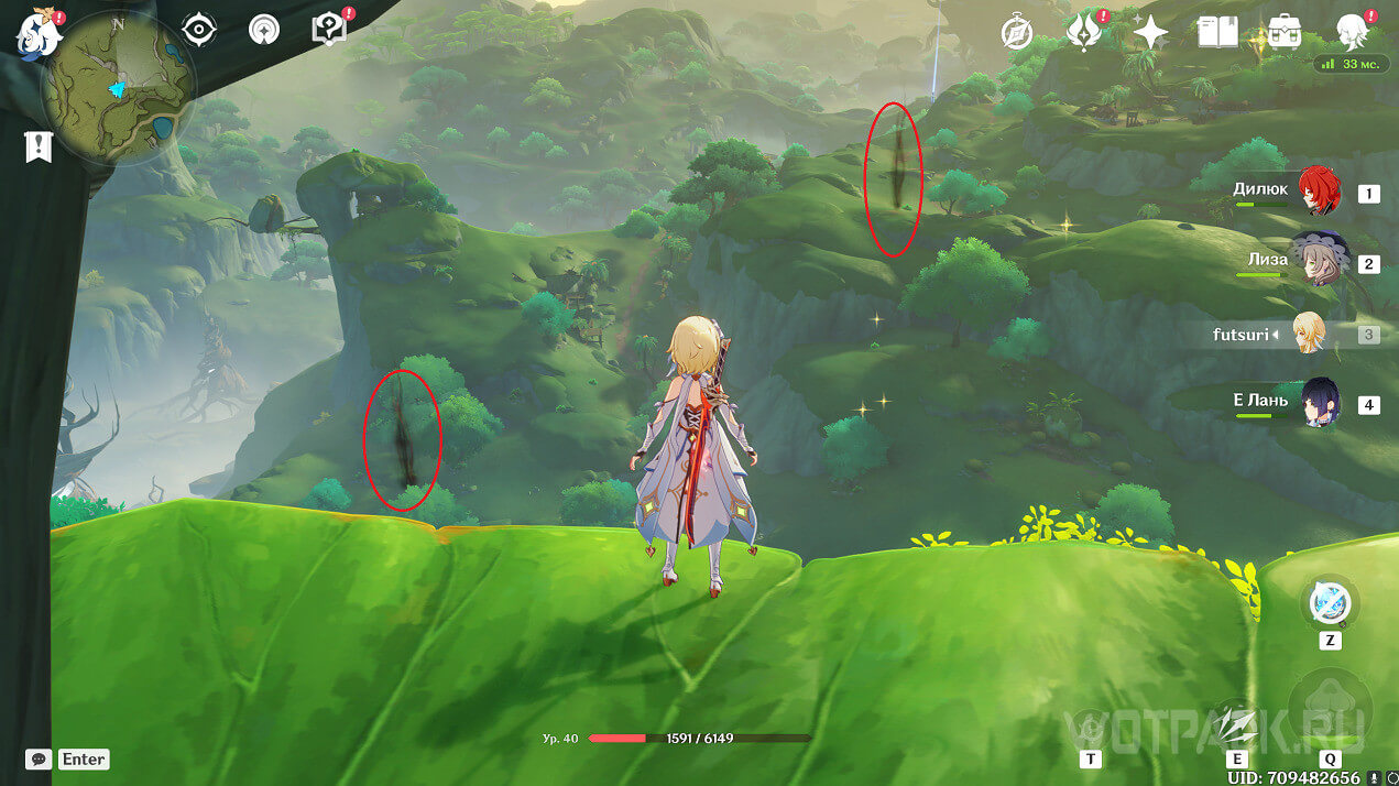 Сначала стоит посетить ту, что ближе. Она расположена на восточном берегу реки, текущей от Деревни Вимара. Перелетите на другую сторону, разберитесь с несколькими хиличурлами (2 обычных и 1 маг бездны) и уничтожьте опухоль Увядания.