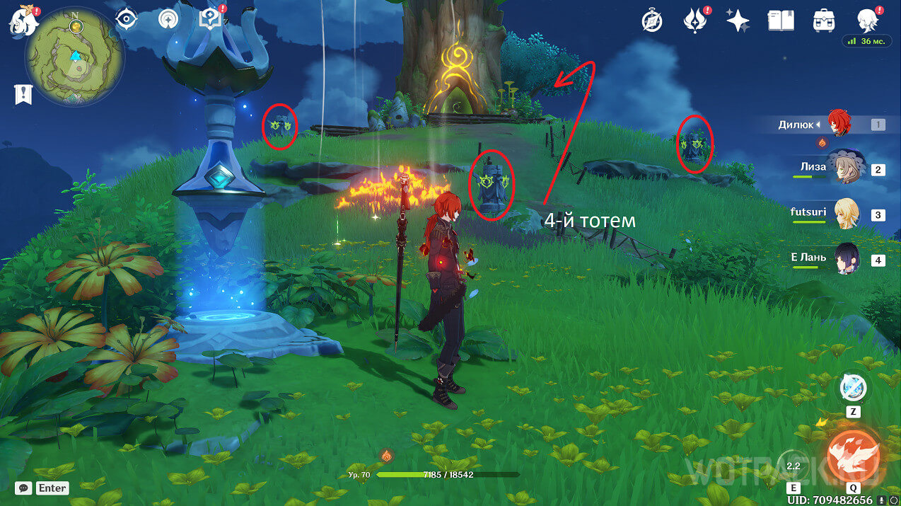Вокруг башни расположено 4 Дендро тотема, которые необходимо активировать максимально быстро. Когда «зажигаете» один, то рядом с ним появляется Анемо слайм. Объекты нужно активировать за короткий промежуток времени, а если рядом враги, то персонаж применит направленное умение к нему. Из-за этого рекомендуем сначала «зажечь» тотемы, уничтожить всех противников, после чего пройтись по второму кругу.