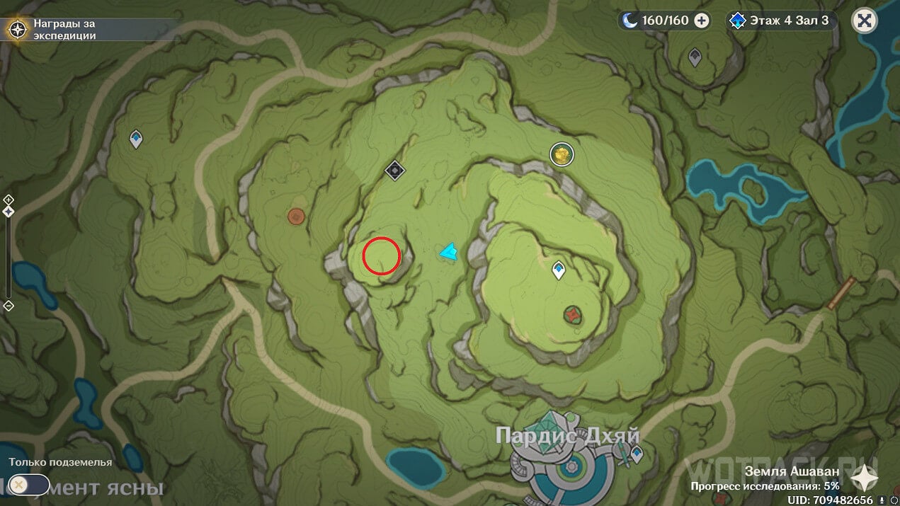 Вторая опухоль расположена на юго-западе от Пардис Дхяй, доберитесь до отмеченного на скриншоте выше места, победите хиличурлов и уничтожьте зарождающуюся опухоль.