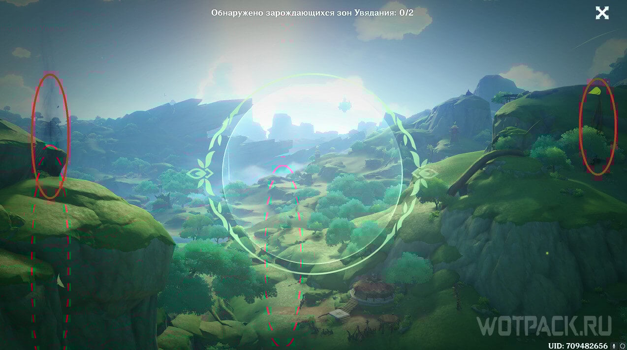Войдя в режим поиска, необходимо вращать линзу при помощи мышки, осматривая окрестности. Обращайте внимание на столб черного дыма: когда найдете такой, наведите на него «объектив», чтобы обнаружить. Область Увядания будет обведена бледно-серым кругом. После того как обнаружили зарождающиеся зоны Увядания, направляйтесь к ним и уничтожьте их.