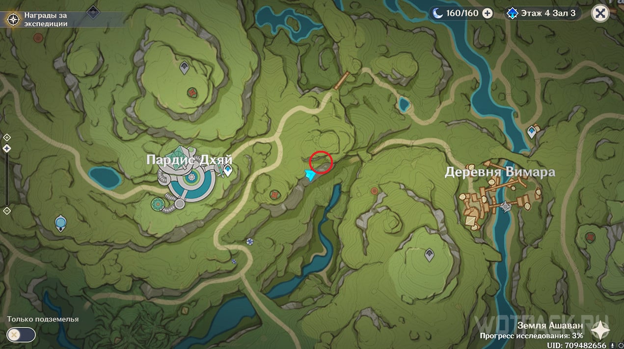 Третья башня расположена на востоке от Пардис Дхяй, на краю скалы около реки. Подойдя к строению, обнаружите, что вход закрыт камнем с печатью. Двигайтесь на север в сторону дороги, там увидите Дендрогранумы, которые необходимо взять, когда разберетесь с хиличурлами.