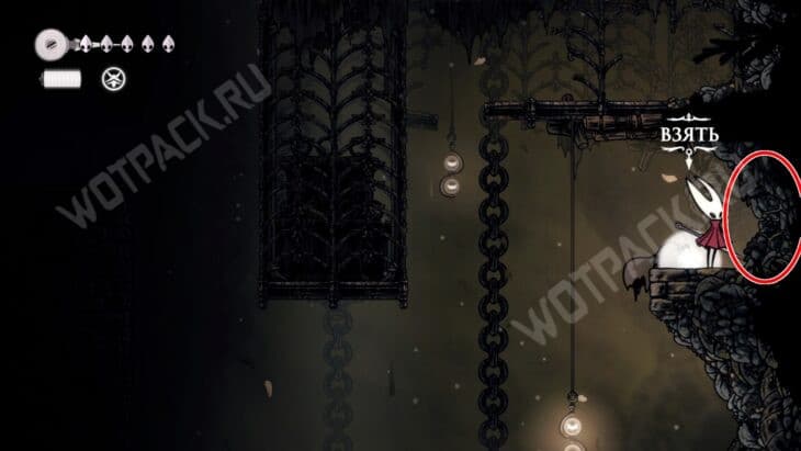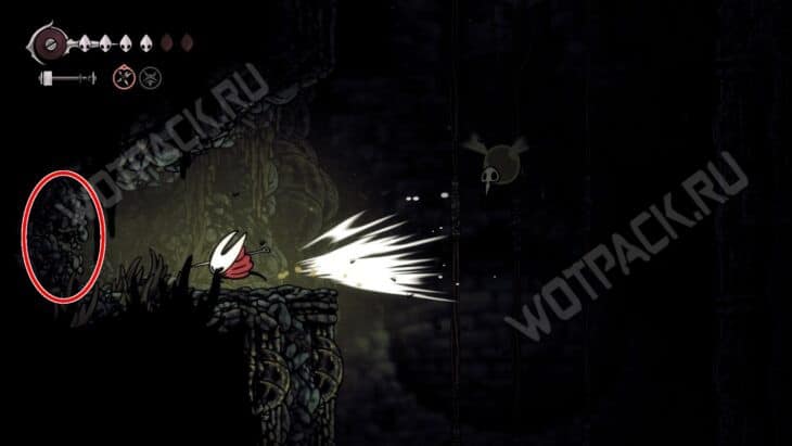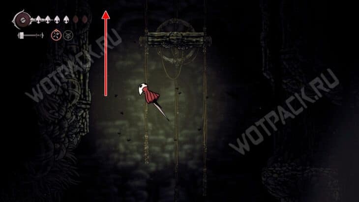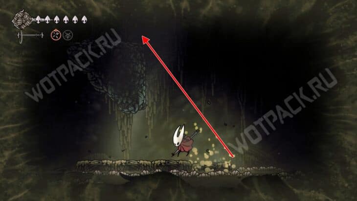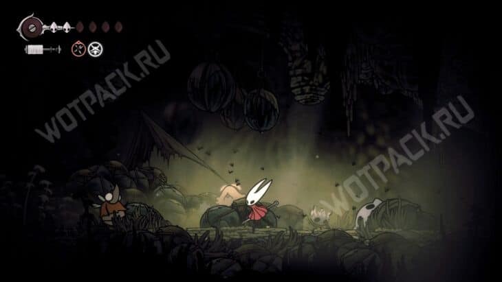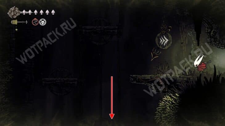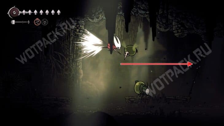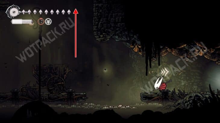 Пробравшись на верхний ярус болота, приблизитесь к финальному испытанию области — опциональному боссу, — но окажетесь слишком далеко от предыдущей точки сохранения. Вот только путешествовать от самого начала биома при проигрыше битвы не придется: в Желчноводье есть секретная лавка за стеной, которую можно найти неподалеку от Желчеграда. Для её обнаружения из комнаты с блохой спрыгните вниз и продолжайте бежать на восток.