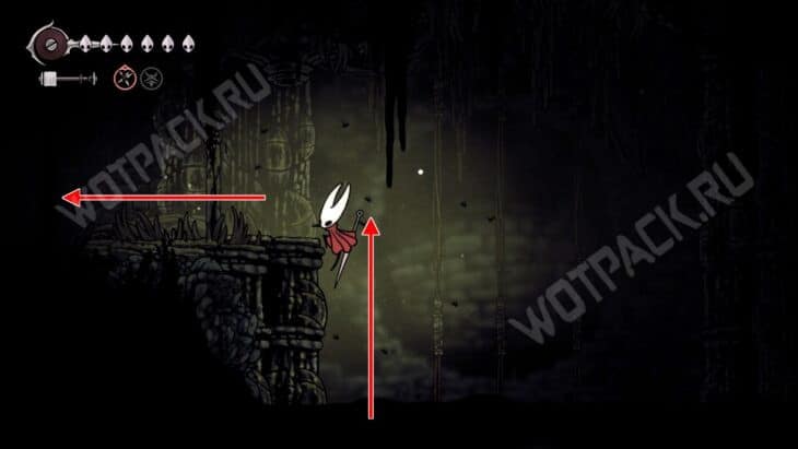 Вернитесь ко входу в Мурглин и проплывите обратно через секретный проход. Сразу за ним висит треугольная платформа — заберитесь на неё, а затем с разбегу запрыгните на левую стену шахты и поднимайтесь по ней.