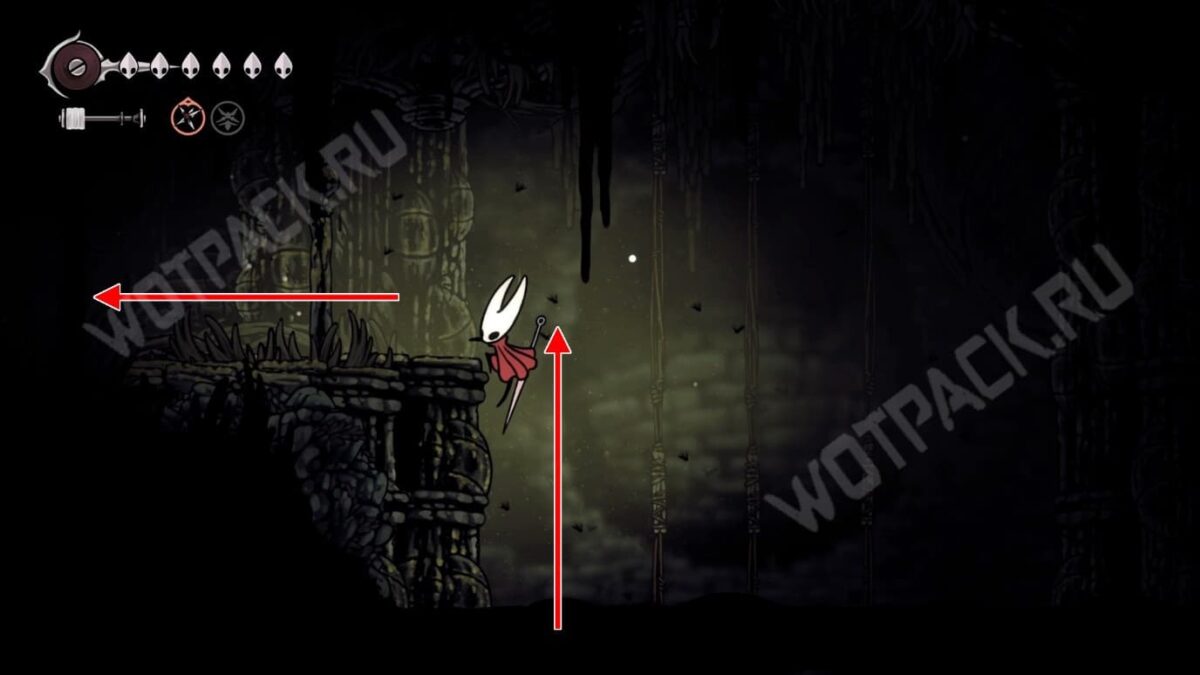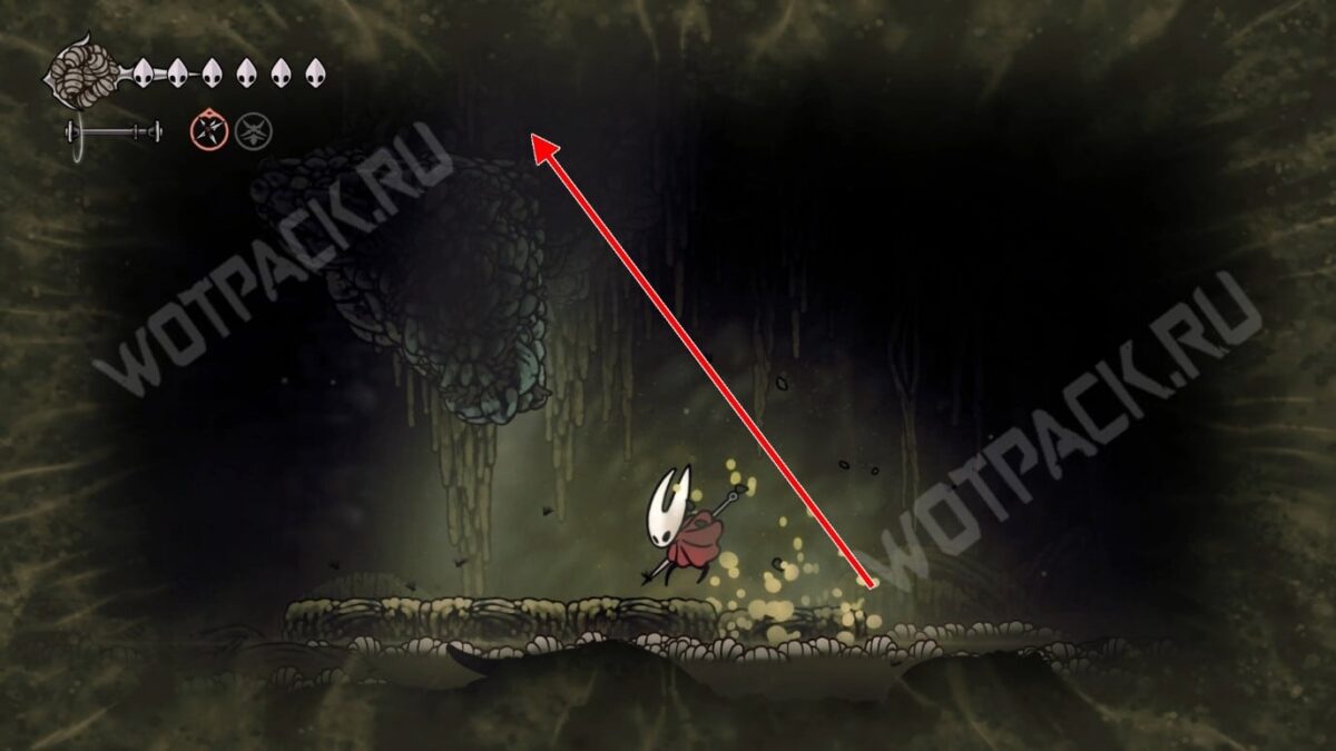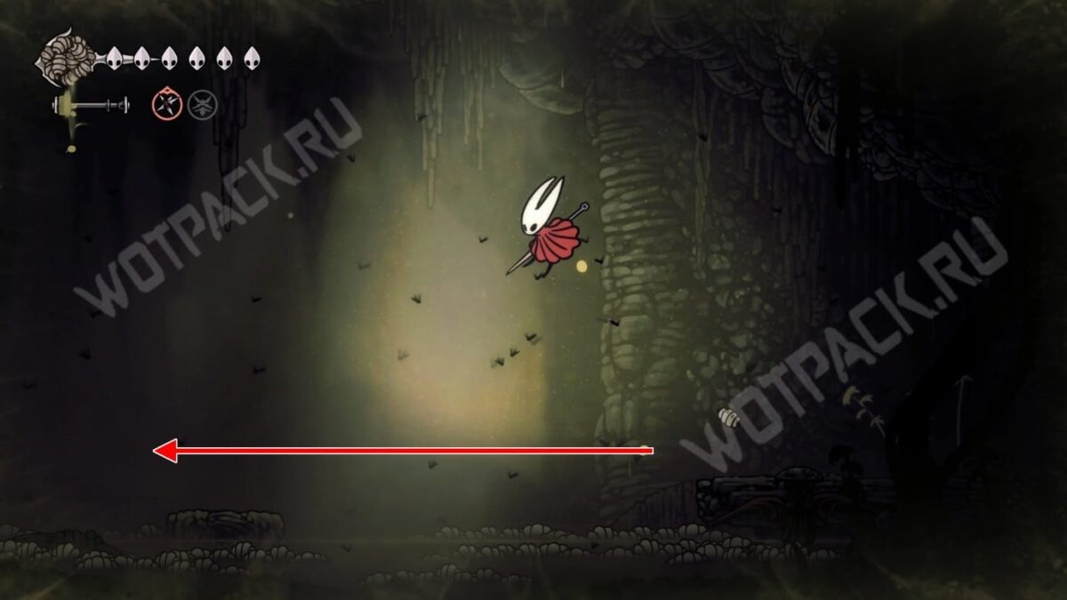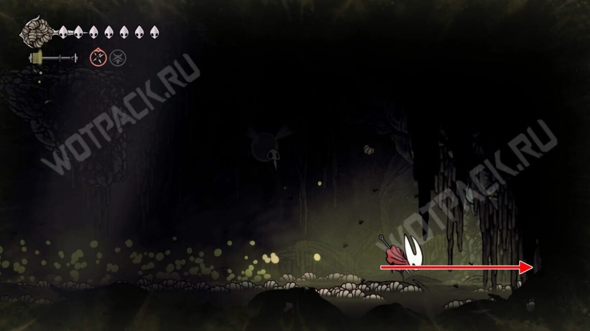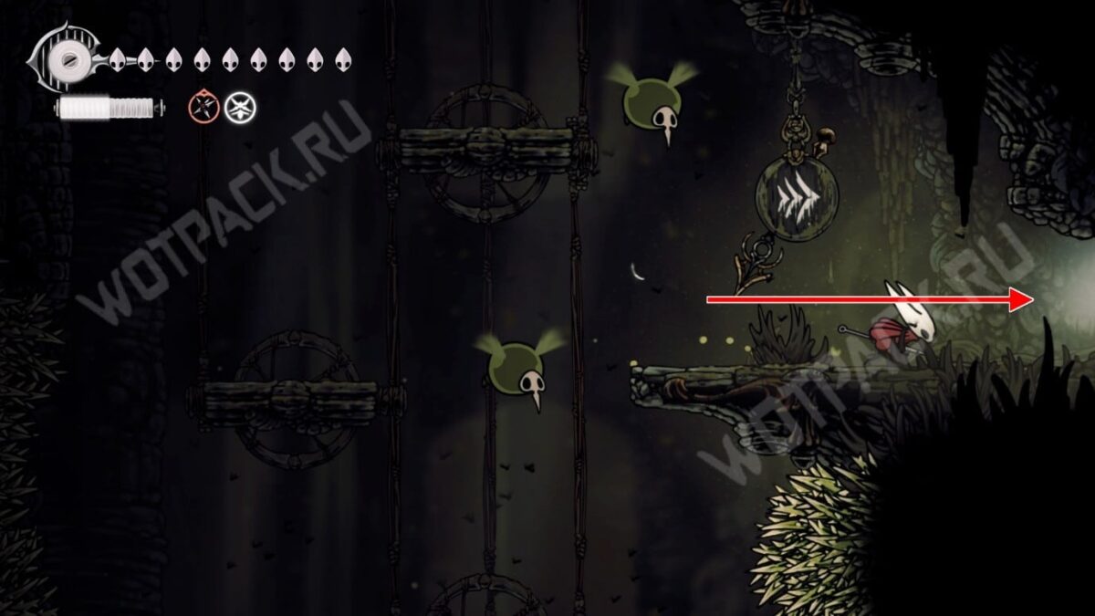 Пробравшись на верхний ярус болота, приблизитесь к финальному испытанию области — опциональному боссу, — но окажетесь слишком далеко от предыдущей точки сохранения. Вот только путешествовать от самого начала биома при проигрыше битвы не придется: в Желчноводье есть секретная лавка за стеной, которую можно найти неподалеку от Желчеграда. Для её обнаружения из комнаты с блохой спрыгните вниз и продолжайте бежать на восток.