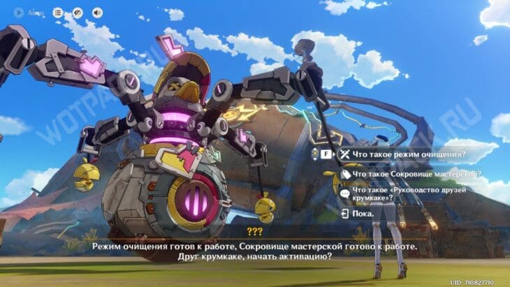 Сражение сразу не начнется. Поговорите с роботом и выберите вариант «Что такое режим очищения?» для начала битвы.