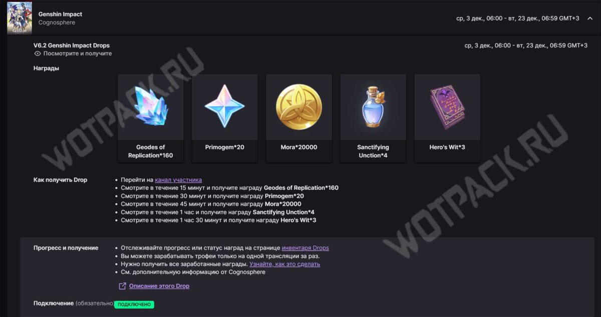 Каждый патч включайте прямые эфиры по Genshin Impact на платформе Twitch и получайте награды Drops. После просмотра стрима в течение 15 минут заберите их в инвентаре на сайте и примите вознаграждение на внутриигровой почте.