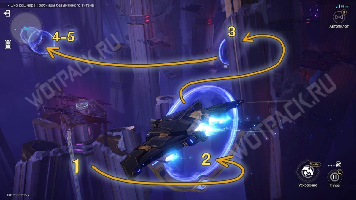 Когда получите управление кораблём, услышите фразу «Отправная точка находится выше..?». В ручном режиме пролетите через пять колец ускорения с определённой стороны: