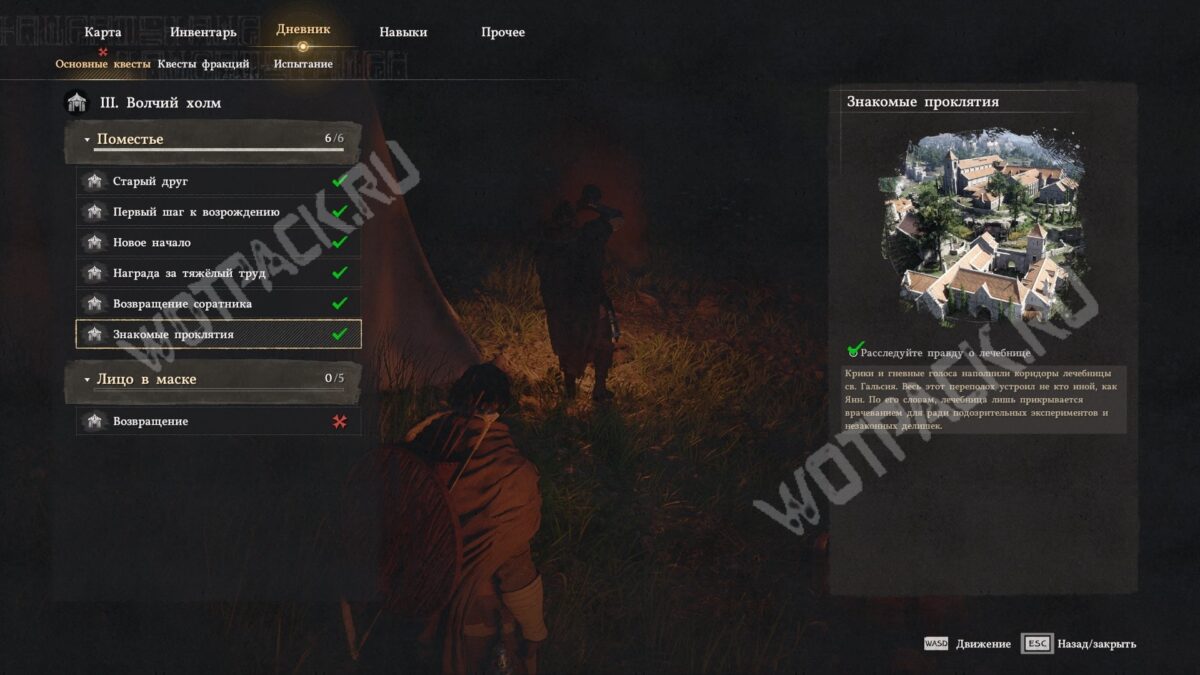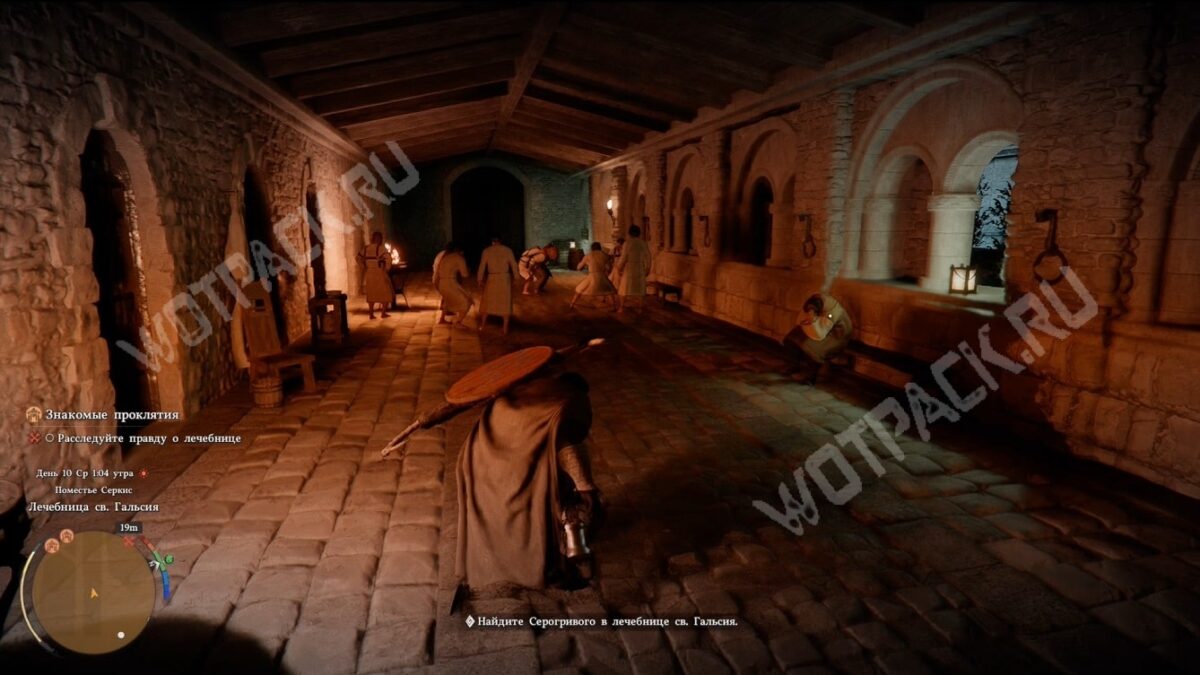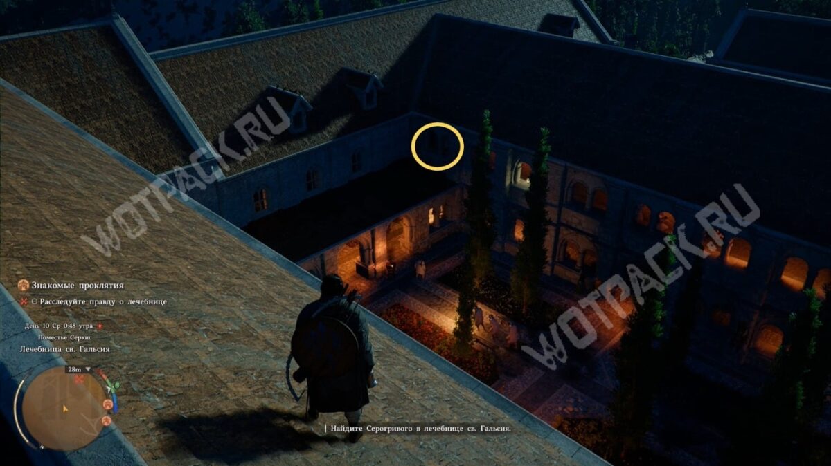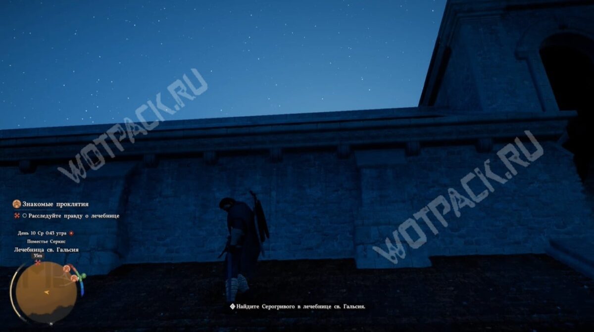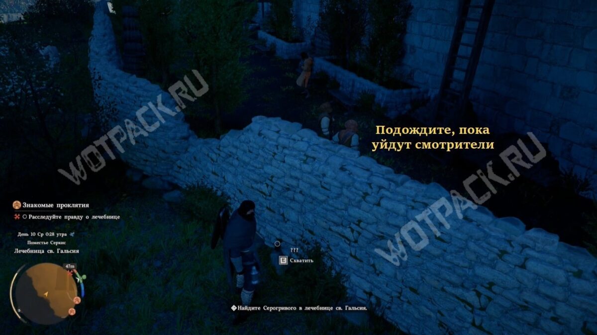 Выполнить цель «Найдите Серогривого в лечебнице св. Гальсия» можно только ночью. Днём не увидите сцену стычки между смотрителями и пациентами в коридоре.