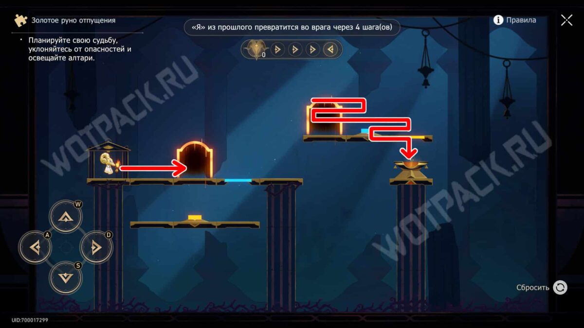 На первых трёх действиях трижды шагайте в правую сторону. Оказавшись на голубом переключателе, сдвиньтесь на ячейку к пропавшему порталу, затем встаньте на жёлтую платформу. Ещё один раз отступите назад, дальше сможете прыгнуть к алтарю.