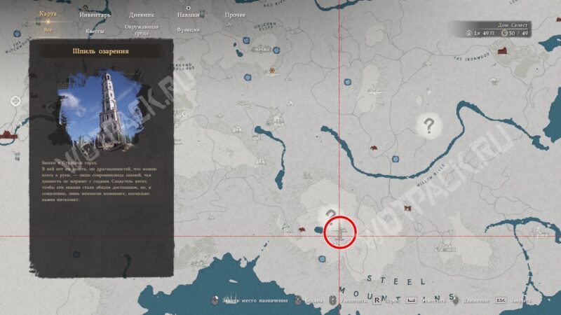 - Шпиль озарения — решите головоломки внутри, чтобы добраться до третьего этажа. На одном из стеллажей с книгами найдёте прикреплённый листок с рецептом.