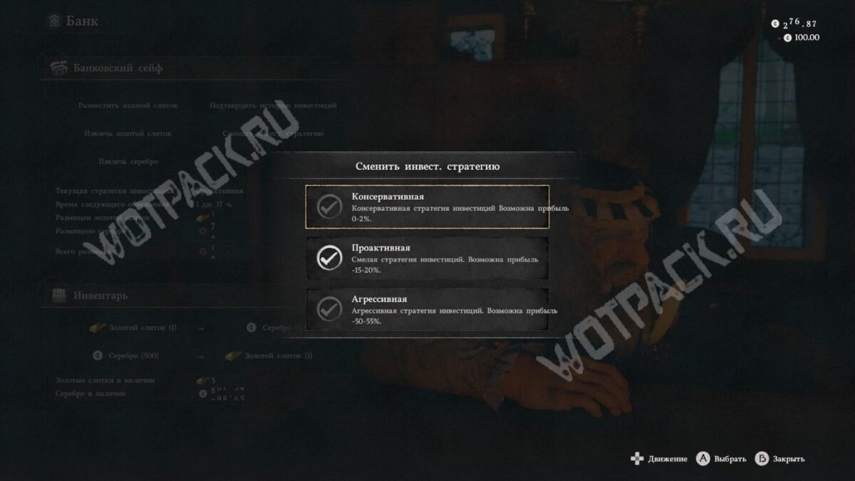 После этого остаётся только ждать, пока пройдёт таймер до обновления. Если хотите перестраховаться, сохранитесь перед визитом в банк — при убытках загрузитесь и попробуйте снова.