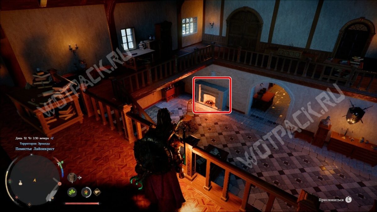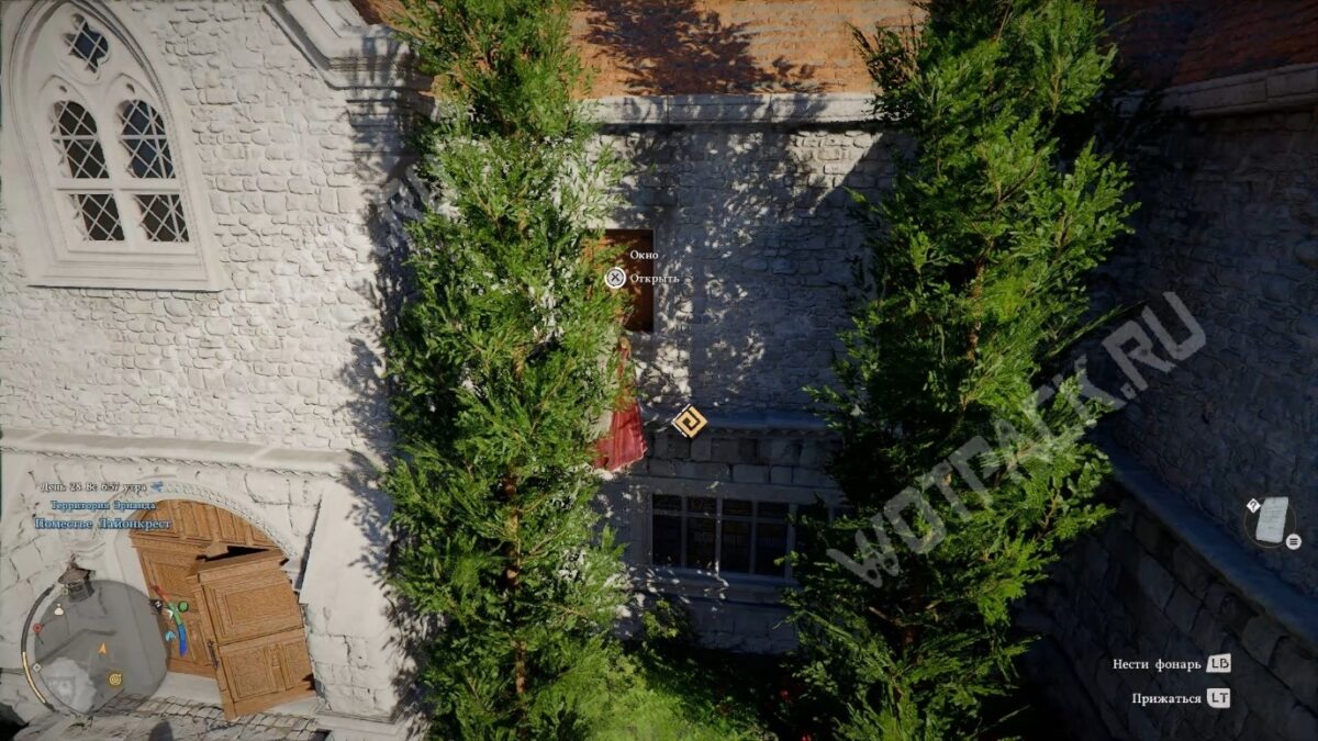 - Проникните в поместье Лайонкрест — желательно это делать под покровом ночи, когда внутри меньше стражи. Заберитесь в любое окно на втором этаже главного здания.
