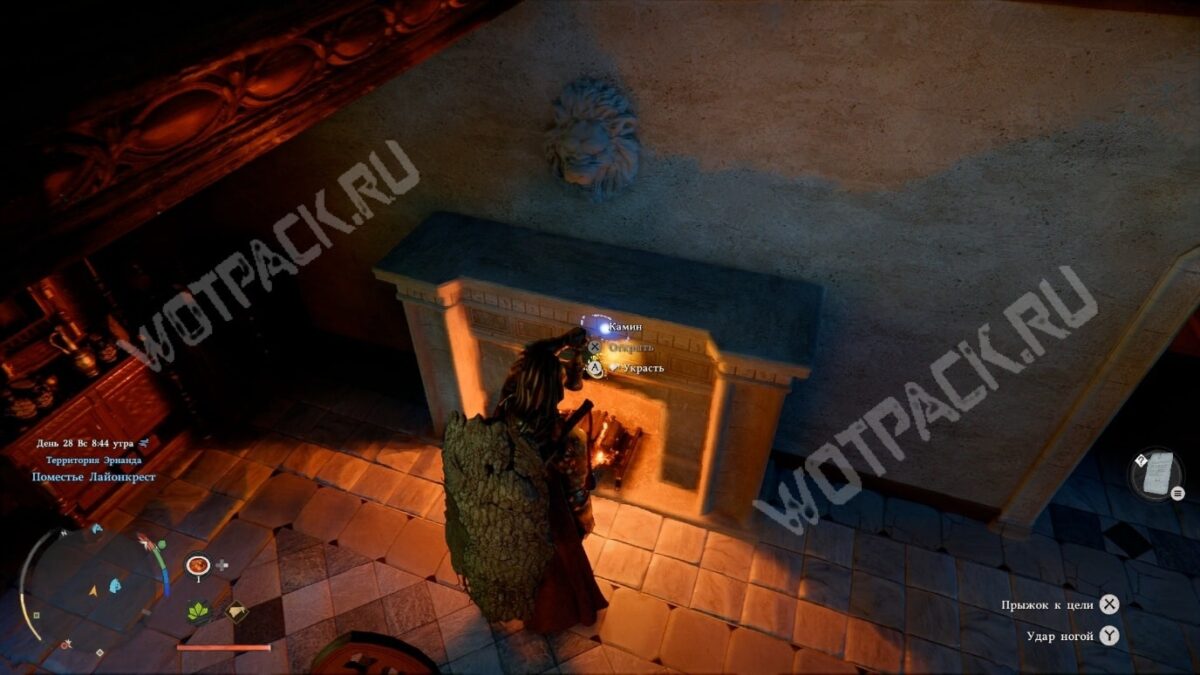 - Украдите ценность из тайника внутри камина — с надетой маской нажмите «Ctrl»/«LB» и наведите указатель на верхнюю часть очага. Когда увидите подсказку «украсть», нажмите соответствующую кнопку.