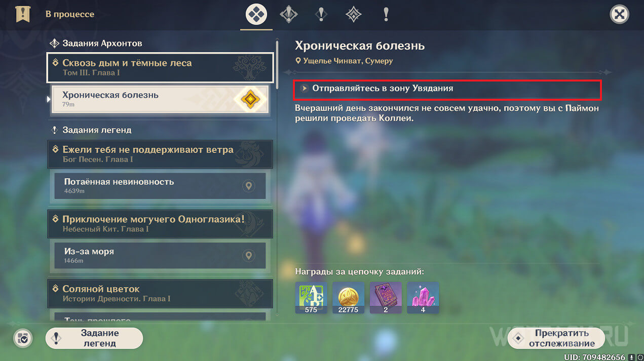 Впервые с зоной Увядания Путешественник столкнется в рамках задания Хроническая болезнь, в задании Архонта Том 3 Глава 1: Сквозь дым и темные леса. Напросившись в поход с Тигнари, друзья встретят людей из лесного патруля, которые расскажут об области, разъедаемой Мараной.