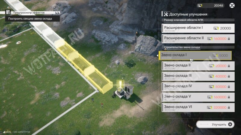 Чтобы купить улучшения, сначала изучите «Звено склада» в ветке «Энергия» стандартного плана АПК. После этого вернитесь к ключевой области и приобретите у робота первый уровень за 5 000 облигаций Долины. Этот апгрейд автоматически разместит три ангара в юго-восточном углу базы.