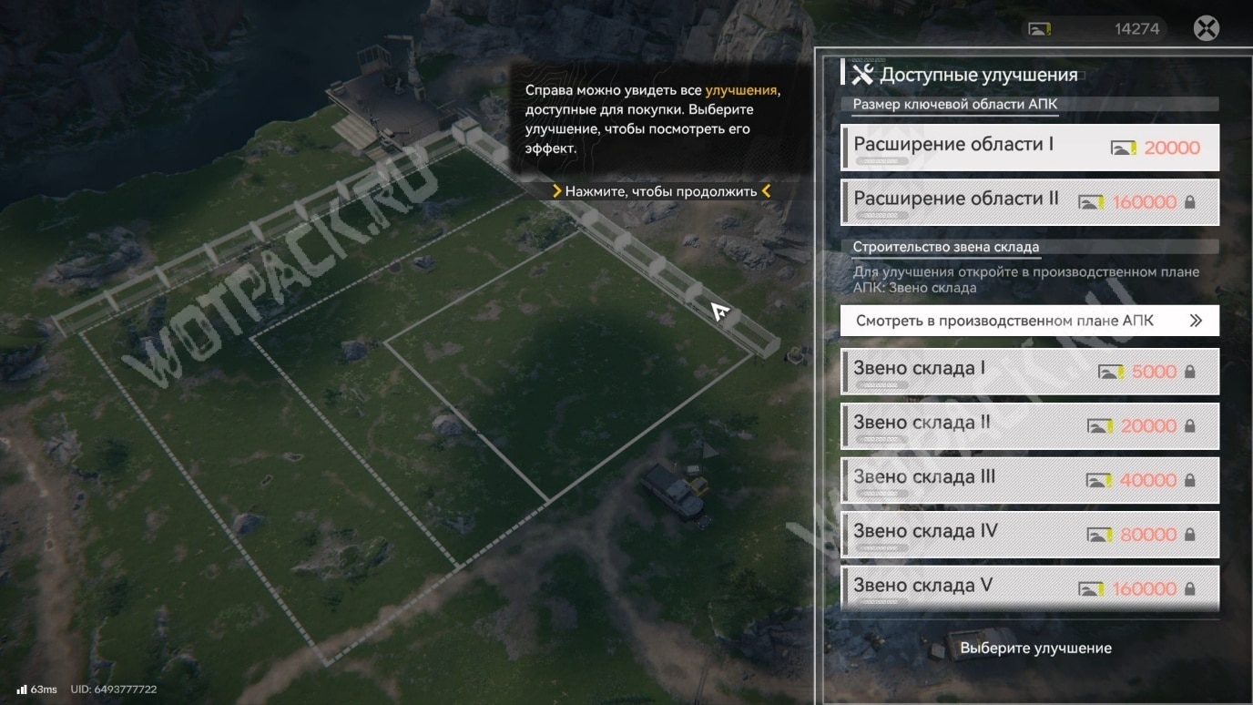 Отправляйтесь в ключевую область АПК в Центре и найдите белого робота-сову в юго-восточном угла базы. Поговорите с ним и ознакомьтесь с улучшениями, доступными для покупки. Помимо расширения ключевой области АПК в ассортименте есть апгрейды для боковых ангаров: