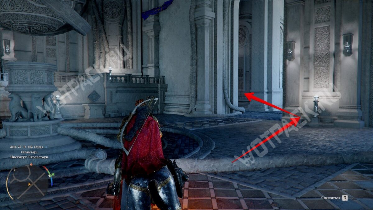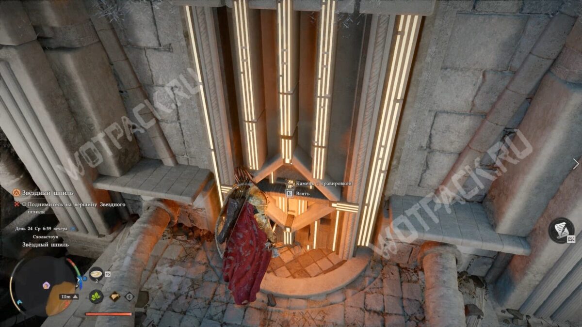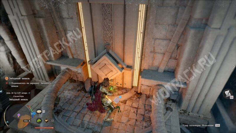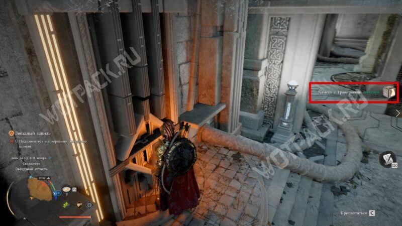 В левой комнате подойдите к правой стене с ромбом. Наведитесь на него, зажмите колесо мыши (или правый стик на геймпаде) и отпустите, чтобы использовать удар пальмары. Когда стена повернётся, заберите из её выемки первый камень с гравировкой.