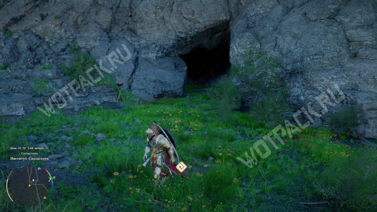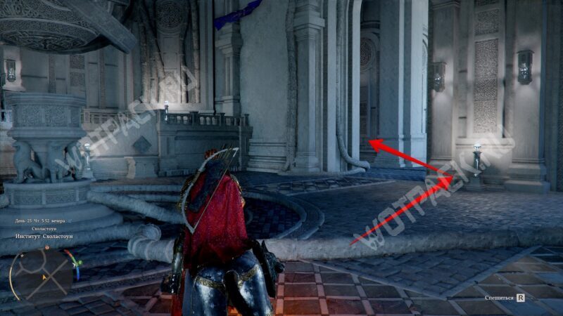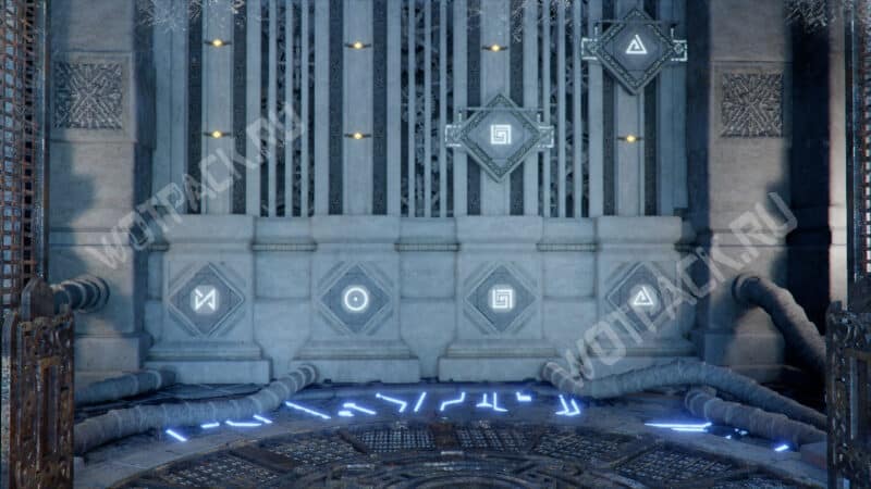 Для того чтобы решить головоломку, нужно правильно расположить четыре ромба с символами. На стенах боковых комнат увидите подсказки о том, на какой высоте должна быть каждая руна. Однако сначала для их активации потребуется найти камни с гравировкой и вставить их в гнёзда кнопок.
