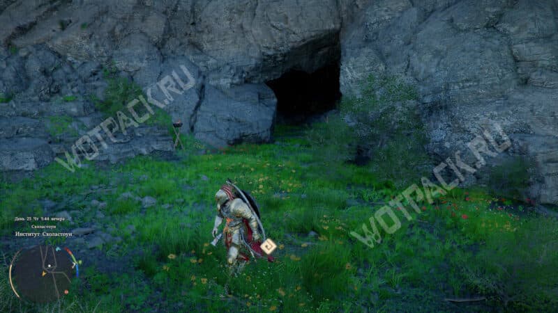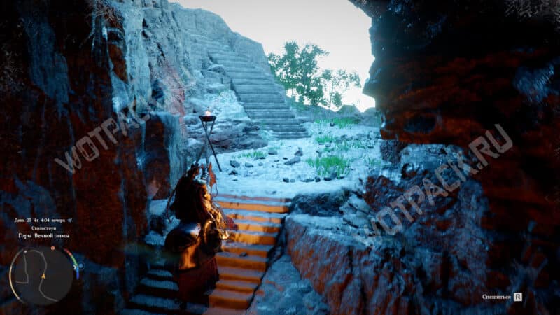 Когда покажется, что оказались в тупике, пройдите чуть дальше и справа заметите пещеру. Пересеките её и выберитесь на заснеженную тропу, где персонаж будет мёрзнуть.